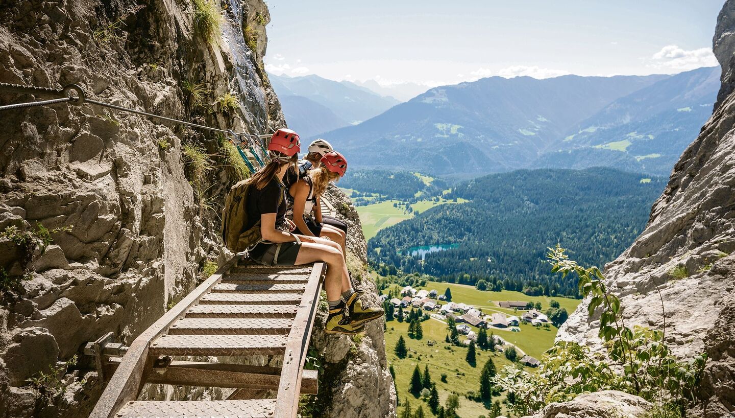 Ausrüstung: Klettergurt, Klettersteigset, Helm und gutes Schuhwerk sind Pflicht.