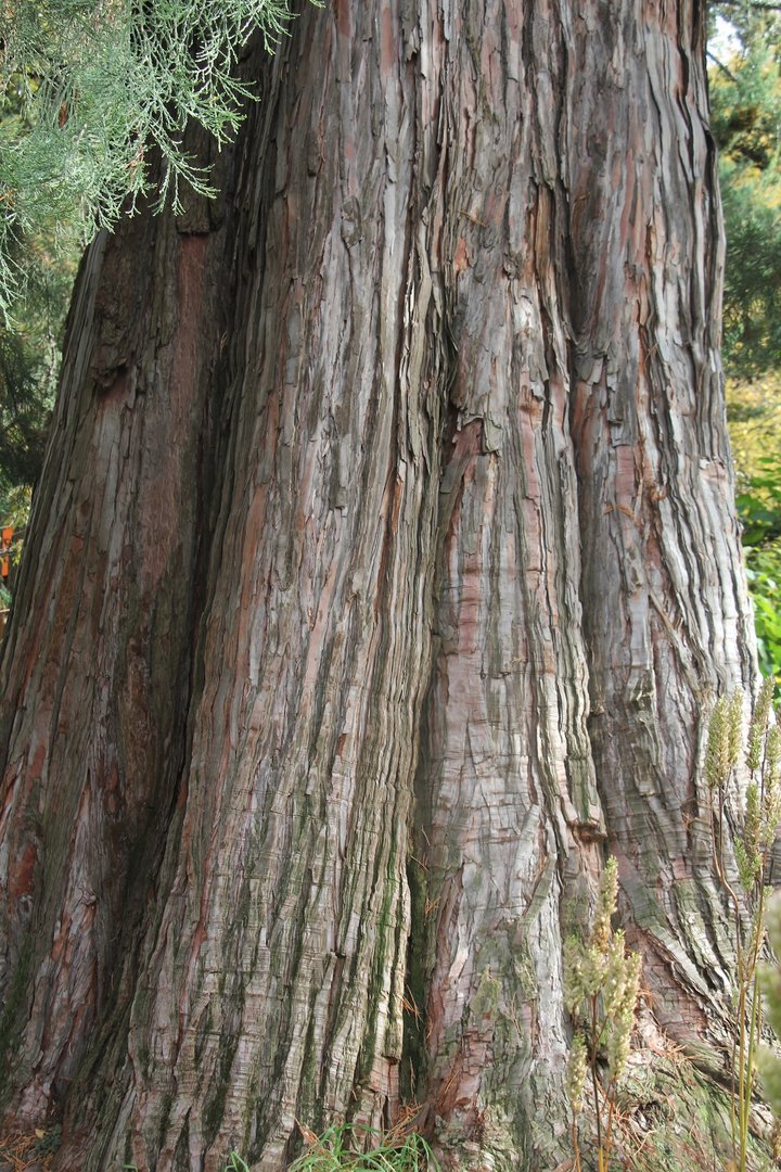 Das grösste Lebewesen der Erde ist ebenfalls ein Zapfenträger. Ein Exemplar ragt im Botanischen Garten Basel in den Himmel. Mit etwa 130 Jahren sei es ein junger Baum, sagt Sophie Weides. Sie steht unter den dunkelgrünen Ästen des 33 Meter hohen immergrünen Riesen. «Die Exemplare am natürlichen Standort an der Westküste der USA sind teilweise über 90 Meter hoch und so alt wie die Menschheitsgeschichte», erklärt die Führerin weiter. Die Zapfen des Mammutbaums seien an Feuer angepasst und würden sich oft erst bei grosser Wärmeentwicklung öffnen und so die Samen freigeben. «Nach einem Brand beginnen die Samen zu keimen, denn dann sind ausreichend Nährstoffe im Boden und es hat wenig andere Pflanzen, die um das Sonnenlicht konkurrieren.» Der Mammutbaum habe fast kein Harz und sei deshalb ganz besonders brandresistent.