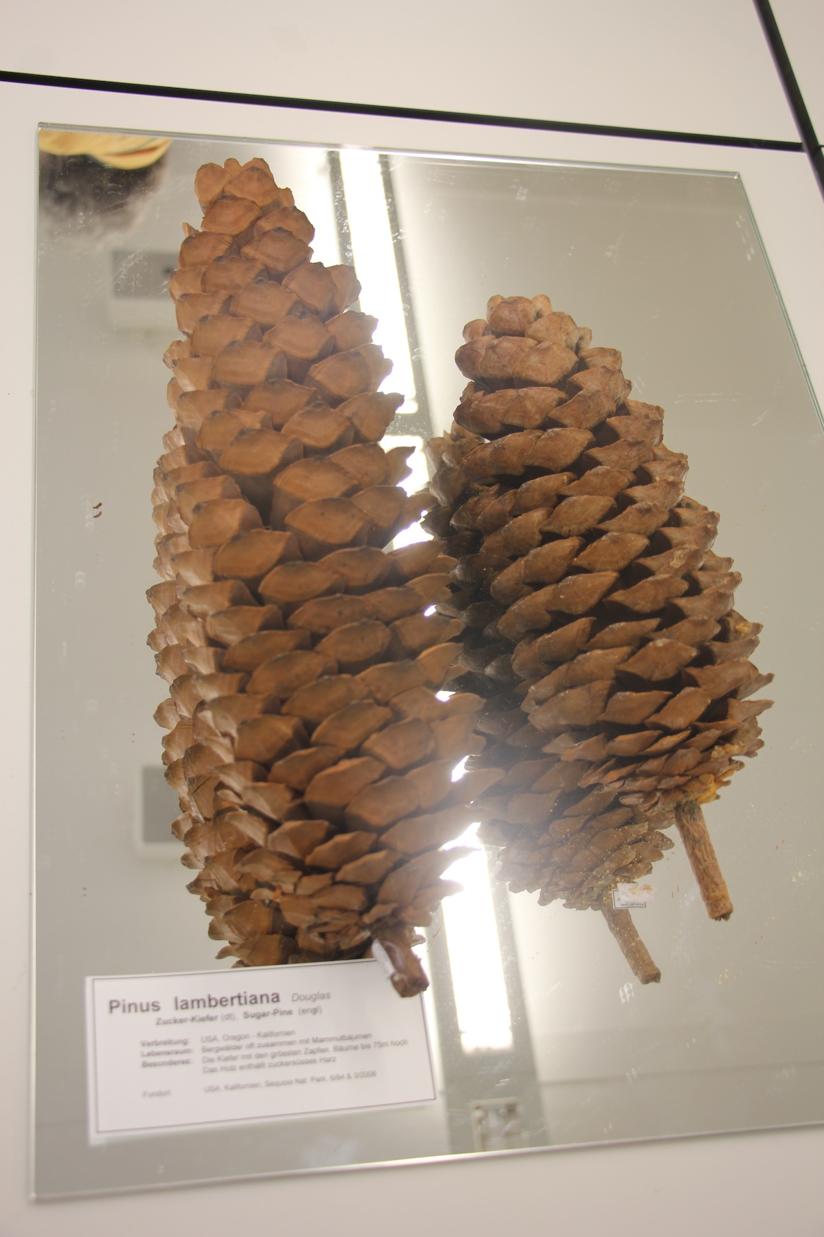Zapfen von vielen unterschiedlichen Arten mit genauer Beschriftung gewähren einen Einblick in die umfangreiche Sammlung Christian Knobels. DerPflanzenspezialist trug eine grosse Vielfalt an Zapfen zusammen, so etwa die kapitalen und wohlgeformten Exemplare der Grosszapfen-Kiefer aus den USA und Mexiko sowie die grössten Zapfen überhaupt, diejenigen der Zucker-Kiefer aus dem Westen Nordamerikas.