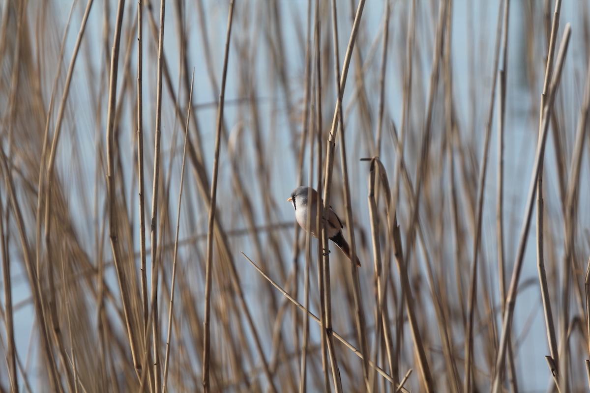 Der Marsch entlang des Kanals geht immer weiter, bis die eigentliche Mauer beginnt, bestehend aus grossen, zusammengefügten Steinen. Nun fallen die Weiden und Erlen linkerhand ab, Sumpf macht sich breit, je weiter die begehbare Mauer in den See führt. Die Schreie einzelne Mittelmeermöwen gellen in den Morgen, Lachmöwen zetern. Hinter einem schmalen Schilfgürtel mit Schlick lecken müde Wellchen des Sees über den Sand. Plötzlich zischelt es nasal aus dem dürren, hellbraunen Röhricht. Da sind sie, die Bartmeisen!