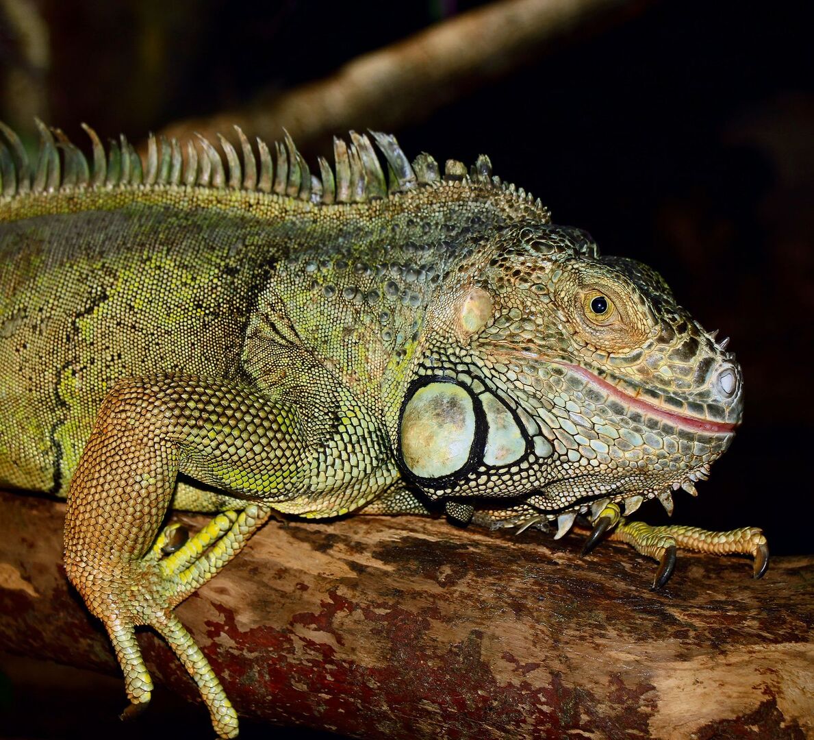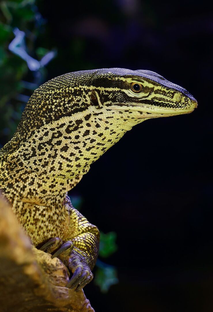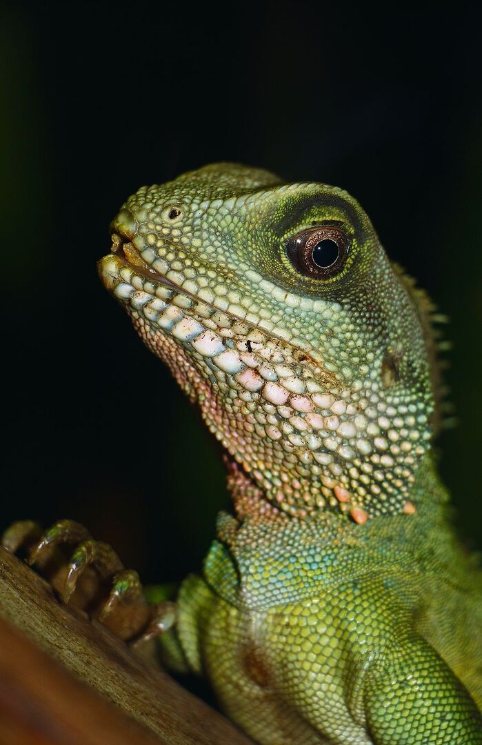 Eine Treppe führt ins Untergeschoss. Dort ist der Besucherraum dunkel gehalten. In hell erleuchteten Terrarien verbirgt sich eine Wunderwelt. Jedes Terrarium weist verschiedene Lichtquellen auf: eine Grundbeleuchtung, Wärmelampen und Leuchtmittel, die ultraviolettes Licht abgeben. «Wenn Reptilien oder Amphibien die Luftfeuchtigkeit, Lichtintensität und Wärme ihres Lebensraums geboten wird, leben sie problemlos 20 Jahre», sagt Léa Maffini. Manche werden zu richtigen Persönlichkeiten, so wie beispielsweise der Grüne Leguan, der aussieht, wie ein Drache mit seinen Hautsäcken an den Wangen und Zacken auf dem Rücken. Auch das Terrarium des Arguswarans ist so gross wie ein Kinderzimmer. Das Reptil aus Australien und Neuguinea äugt neugierig von einem fast senkrechten Ast, an den es sich gekrallt hat. Im Gegensatz dazu verschwindet die Grüne Wasseragame im Halbschatten der Vegetation ihres Terrariums.