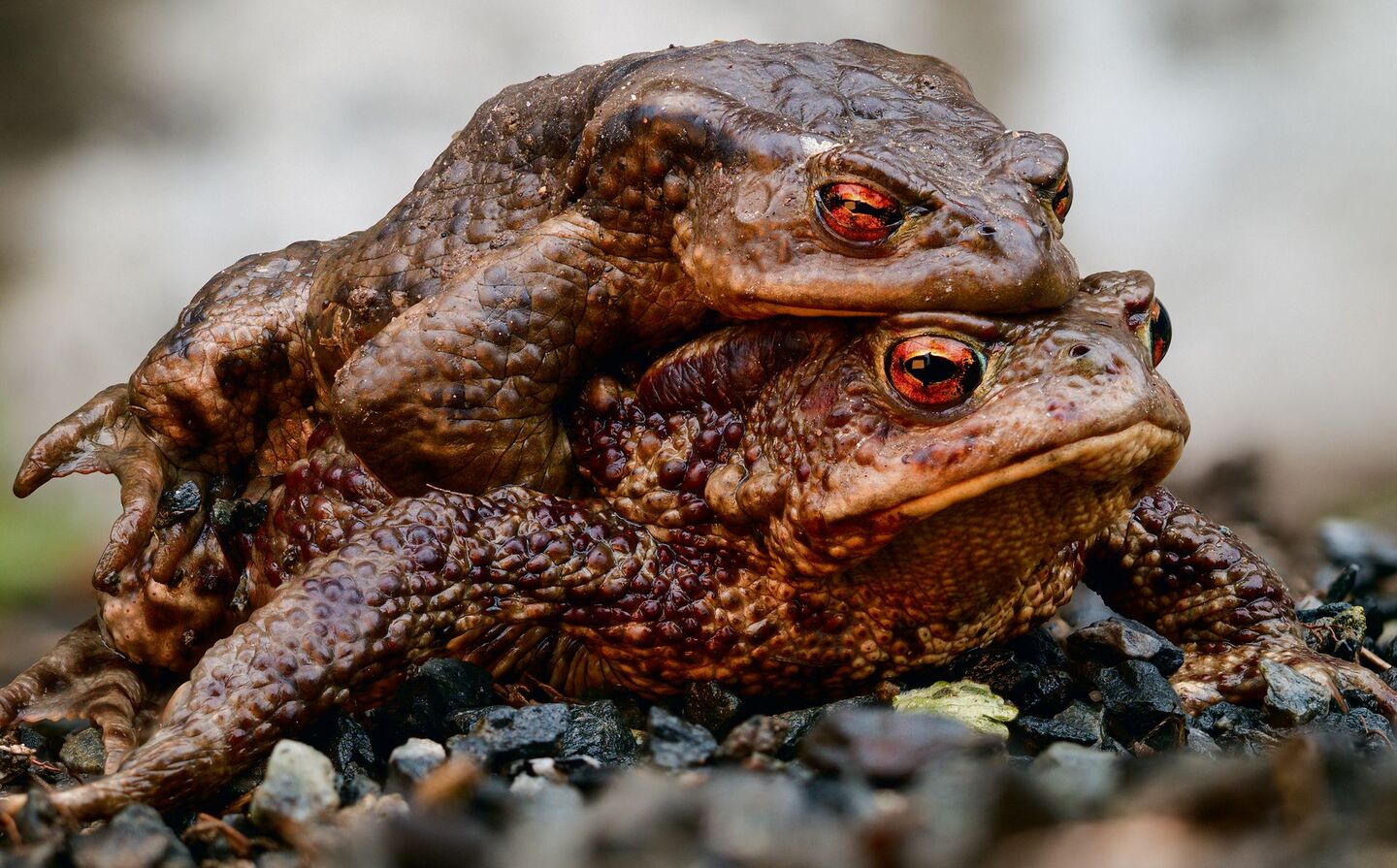 Das Erdkrötenmännchen hat nur eines im Sinn: Es will sich mit einem Weibchen paaren. Nur mit Mühe kann der feste Klammergriff um die Finger gelöst werden, um den liebestollen Krötenmann am Rand des Teichs auf der anderen Strassenseite abzusetzen. Da ist sein Kumpan weiter vorne schon besser dran. Er lässt sich von einem dicken Weibchen aus dem Wald zum Teich tragen, denn er sitzt huckepack auf seiner Partnerin. Damit die Umklammerung auch gut gelingt, bilden sich bei den Männchen besondere Brunstschwielen an den Vorderfüssen, die ein Abrutschen auf der glitschigen Haut verhindern. Das umklammerte Weibchen ist wesentlich grösser, der Bauch scheint dick und aufgebläht.