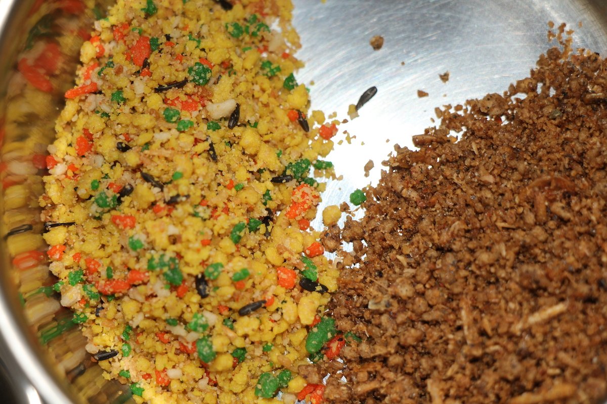 Wellensittichen und Finkenvögeln nehmen auch animalische Kost zu sich. Finken versorgen damit besonders auch ihre Jungen. Es gibt Insekten-Mischungen im Zoofachhandel, die als kleine Beigaben gerecht werden können. Der spezialisierte Zoofachhandel bietet auch gefrostete Pinkymaden und Buffalos, die Larven von Getreideschimmelkäfern, an. Für Prachtfinken ist das ein ideales Ergänzungsfutter, besonders auch während der Jungenaufzucht. Ideal sind aber auch morsches Holz und verwelktes Laub, das auf den Boden der Voliere gelegt wird. Es regt die Sinne der Vögel an, darin zu nesteln, und sie finden immer auch kleine Insekten.