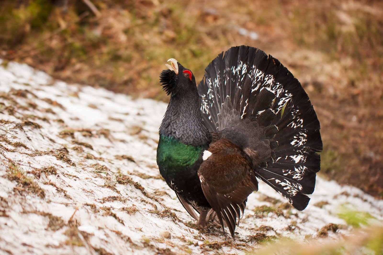 Der bei uns ebenfalls heimische und selten Auerhahn legt sich während der Balz genauso ordentlich ins Zeug wie der Kiebitz. Allerdings vollführt er seinen Balztanz am Boden, plustert sich auf und gibt den arttypischen Balzruf bestehend aus mehreren Elementen von sich. In der Jägersprache werden diese Elemente Knappen, Trillern, Hauptschlag und Wetzen bzw. Schleifen genannt.