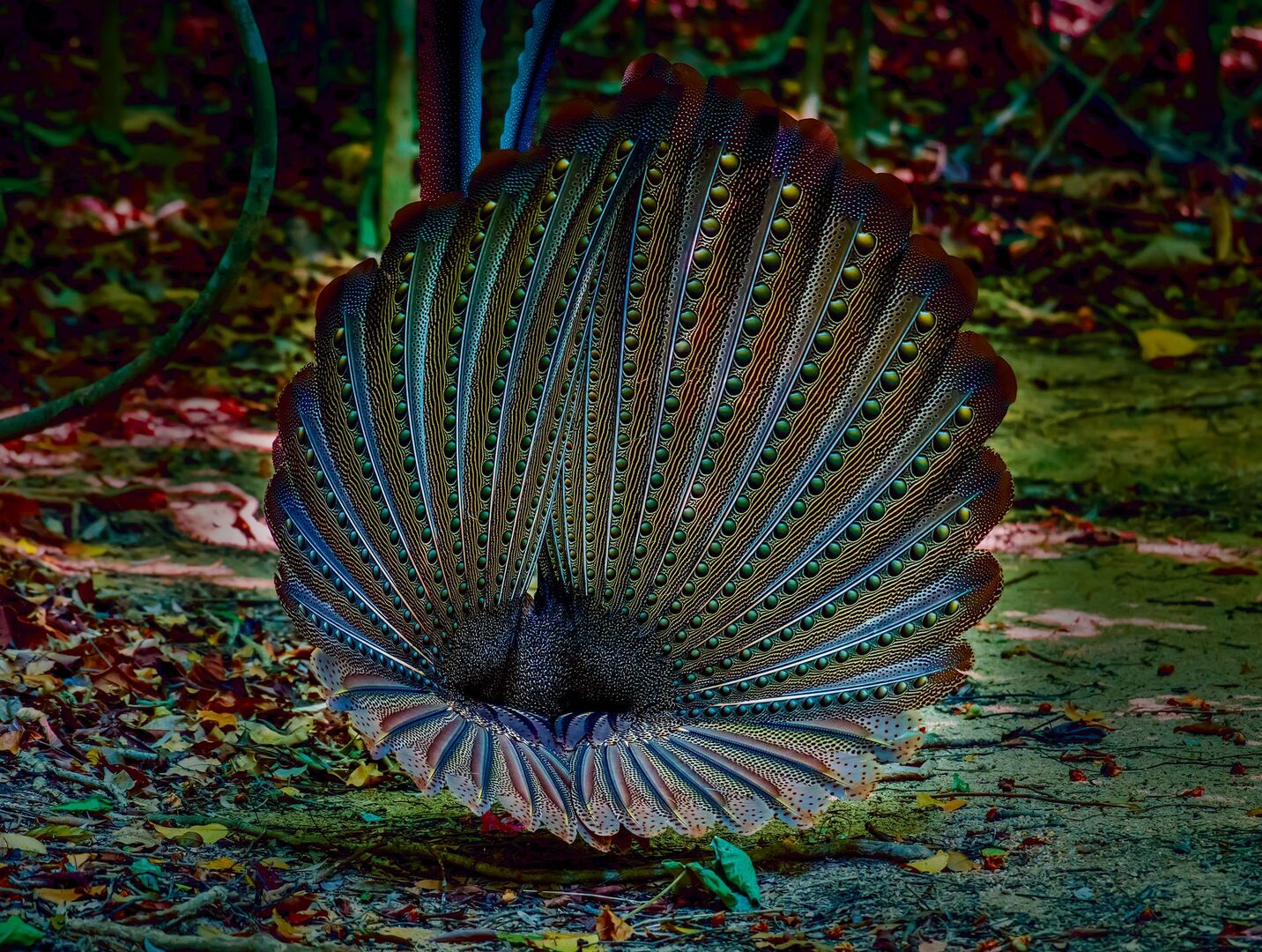 Mit Federn, auf dem Waldboden verborgen, punktet auch der Argusfasan. Er stammt aus den feuchtwarmen Regenwäldern des tropischen Südostasiens wie etwa aus Malaysia, Bangladesch und Thailand. Wenn er ein Weibchen anbalzt, drapiert er seine langen Schwingen und Schwanzfedern zu einem grossen Oval. Nur der Kopf mit der nackten blauen Haut und der Schnabel, der gelb leuchtet, sind in der Mitte zu sehen – ein wundervoller und gleichzeitig irritierender Anblick. Die zahlreichen augenförmigen Punkte auf den Federn sehen aus, als würde das Weibchen mit Argusaugen beobachtet. Argus stammt aus der griechischen Mythologie und war ein Riese mit hundert Augen, von denen nur ein Paar schlief, während der Rest wachte. Ihm entging nichts! Auf das Weibchen verfehlt die aufgeblasene, pompöse Erscheinung seine Wirkung nicht. Argusfasane werden wegen der Lebensraumzerstörung immer seltener.