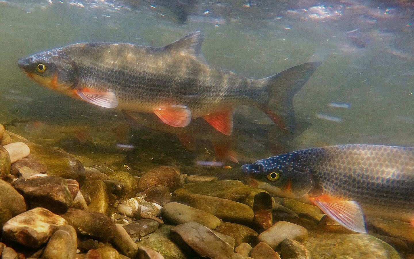 Auch vier Fischarten gelten in der Schweiz als bedroht, primär wegen ihres sehr kleinen Verbreitungsgebiets. Der «König des Doubs» kommt in der Schweiz ausschliesslich im jurassischen Einzugsgebiet des Flusses auf einem Abschnitt von lediglich 30 Kilometern vor. Der auch Apron genannte Fisch bewohnt Fliessgewässer mit einem Untergrund aus Kies und benötigt einen hohen Sauerstoffgehalt. Die Entfernung künstlicher Hindernisse im Doubs ist eine der Prioritäten zur Erhaltung des Schweizer Bestands, sodass der genetische Austausch zwischen den Populationen weiter flussabwärts verbessert werden kann.
