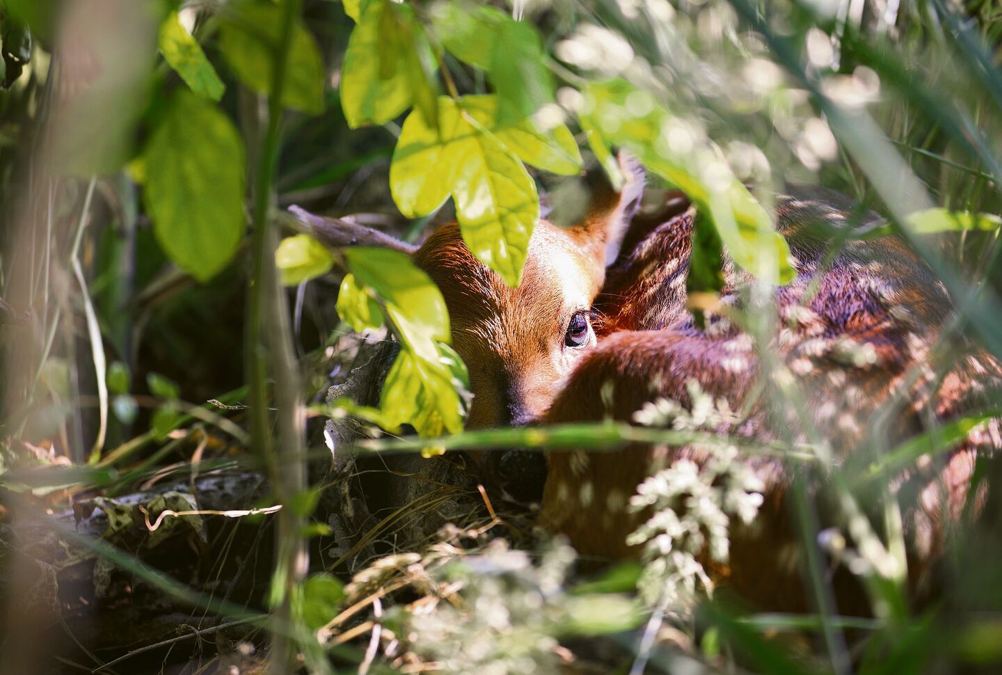 Dank der Rehkitzrettung fallen in der Region viel weniger Kitze dem Mäher zum Opfer als früher. «Das ist nebst dem Tierschutzaspekt auch generell wichtig für den Bauern», erklärt Stäger, «denn durch Kadaverteile können Bakterien, die Botulismus verursachen, ins Futter der Kühe gelangen.» Solche Fälle seien in den letzten Jahren zum Glück selten vorgekommen. So profitieren alle von der Rehkitzrettung. Einmal vor dem Mäher gerettet, bekommen die Kitze von Martin Stäger Ohrmarken verpasst. Ein kleiner Piecks für ein sowieso schon gestresstes Tier. «Der Stress der Rettung und Markierung ist allerdings bei Weitem besser, als in einer Mähmaschine zu Tode zu kommen», betont der Tierarzt und schaut unter ein weiteres Gebüsch. Gut versteckt vor ihm im Unterholz liegt plötzlich ein kleines Rehkitz. Aus grossen, dunklen Augen schaut es den so viel grösseren Menschen an, bleibt jedoch liegen. «Das Kitz ist wahrscheinlich kaum eine Woche alt. Bis zum Alter von 10 bis 14 Tagen flüchten die Jungtiere meistens nicht.»