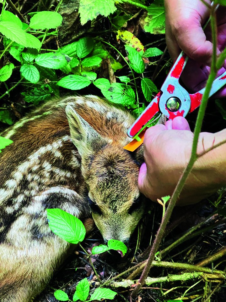 Geduldig warten die jungen Rehe, bis ihre Mutter vom Äsen zum Säugen zurückkommt, und verlassen sich dabei ganz auf ihre Tarnung. Die Ricke befindet sich oft ganz in der Nähe. Sehen tut selbst Stäger sie selten. Aber dank seiner jahrelangen Arbeit in seinem Revier weiss der Jäger oft, in welchem Waldstück wie viel Rehe ihre Jungtiere zur Welt bringen. «Rehe sind ziemlich standorttreu», erklärt Stäger und holt aus seiner Tasche zwei Ohrmarken. Es handelt sich dabei um ähnliche Marken, wie sie auch für Lämmer verwendet werden. Mit einer Zange bringt er jeweils eine der Marken an jedes Ohr des kleinen Kitzes an. Dieses quiekt kurz, bleibt aber ruhig liegen. Stäger ist routiniert, sodass die Prozedur rasch abläuft. Danach entfernt sich der Tierarzt vom Kitz und gibt so der Mutter die Chance, zu ihrem Nachwuchs zurückzukehren. Die Ricken scheinen die Marken an ihren Kitzen nicht zu stören, sodass sie die markierten Kitze problemlos wieder annehmen.