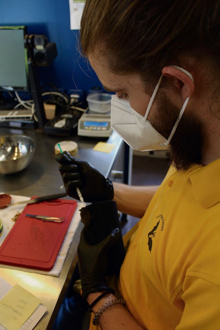 Mattia Turra ist Experte im Sezieren von Mehlwürmern. Eklig findet Turra die Larven aber schon lange nicht mehr, sind sie doch die Grundlage für den Brei, mit denen der 24-Jährige verletzte und geschwächte Fledermäuse aufpäppelt. Bereits das zweite Jahr in Folge hilft der Zivildienstleistende als einer von rund 900 Ehrenamtlichen beim Schweizer Fledermausschutz, und kümmert sich um das Wohlergehen von momentan sechs Pfleglingen. «Vorher habe ich mich noch nie so richtig mit Fledermäusen auseinandergesetzt. Aber beim näheren Betrachten sind sie wirklich herzige und faszinierende Tiere», schwärmt Turra, während er einer Fledermaus mit einem Wattestäbchen den Mund abwischt. Manche der kleinen Säuger sind äusserst chaotische Fresser, sodass einiges von dem mit einer Pinzette verfütterten Nahrungsbrei daneben geht und das feine Fell verkleben kann.