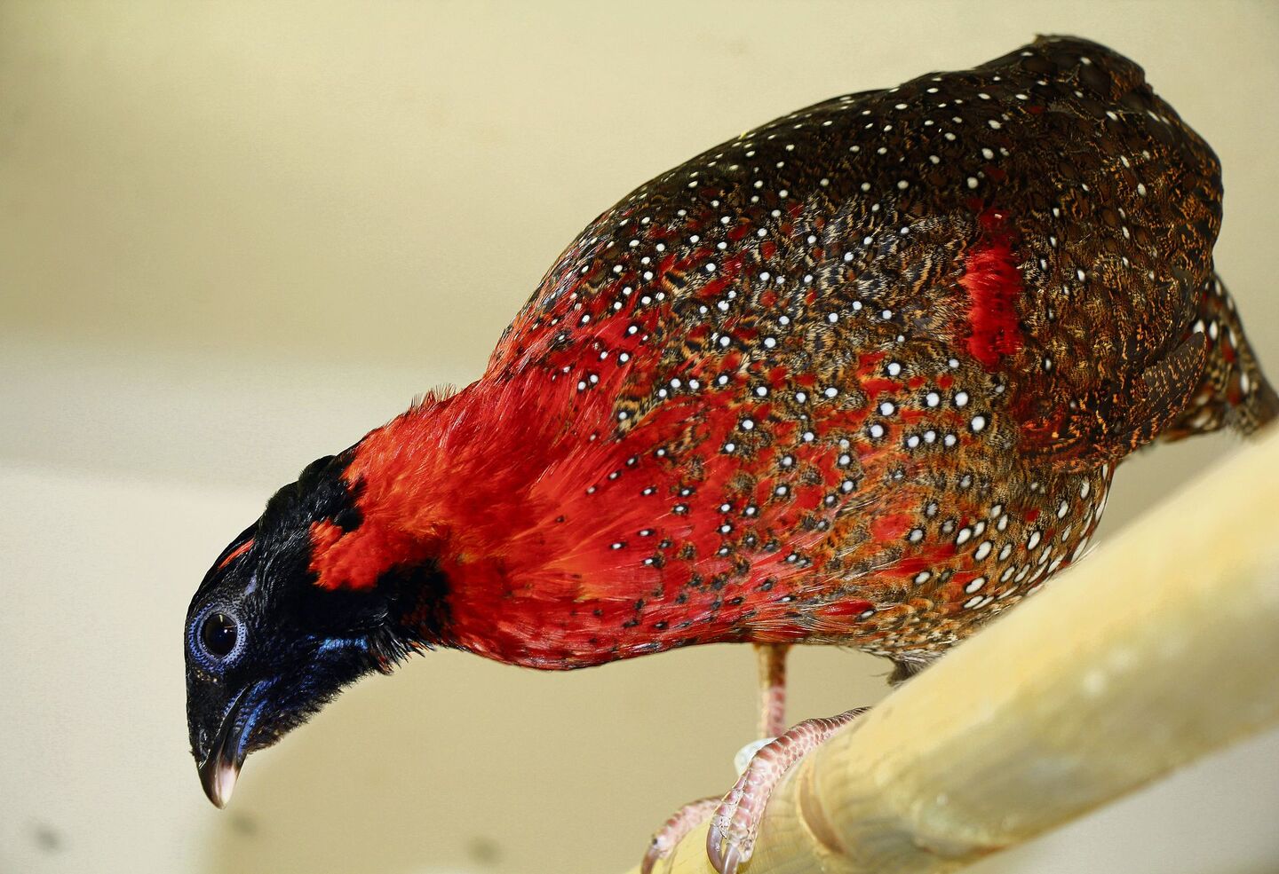 Die Voliere rechts des Eingangs zu den Innenräumen ist einem Paar Satyrtragopanen vorbehalten. Auch hier zieht wiederum das Männchen den ersten Blick auf sich. Der hellblaue Kehllatz und die weissen Punkte auforangem Gefieder lassen es edel erscheinen. Trago-pane werden noch eindrücklicher, wenn sie balzen. Um Weibchen zu gewinnen, richten sie beidseits des Kopfs Fleischzapfen auf, die wie Hörnchen wirken. Der Kehllatz wird bis zur Brust ausgedehnt, dazu werden die Perlaugenflecken des Gefieders eindrücklich präsentiert. Satyrtragopane wurden im Himalaya in Höhen bis zu 4250 Meter gesichtet. Da sie in der Natur oft in verlassenen Raubvogelhorsten brüten, montierteMargarete Sandmeier im Innenraum in der Höhe einen Korb. «Ein Ei wurde schon gelegt», sagt sie lachend. Es sei auch ein Ziel, die Arten zu züchten.