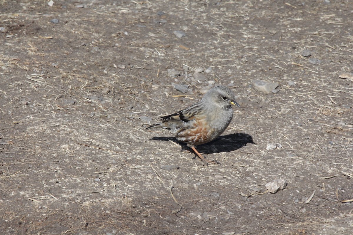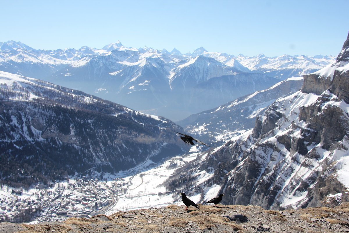 Sollte er nicht auftauchen lohnen andere gefiederte Alpenvögel und ganz bestimmt auch die Aussicht, die bis zum Matterhorn reicht. Alpendohlen hüpfen nahe heran und Alpenbraunellen lösen sich aus dem bräunlichen Gras. Typische Bewohner hoher Alpenzonen.