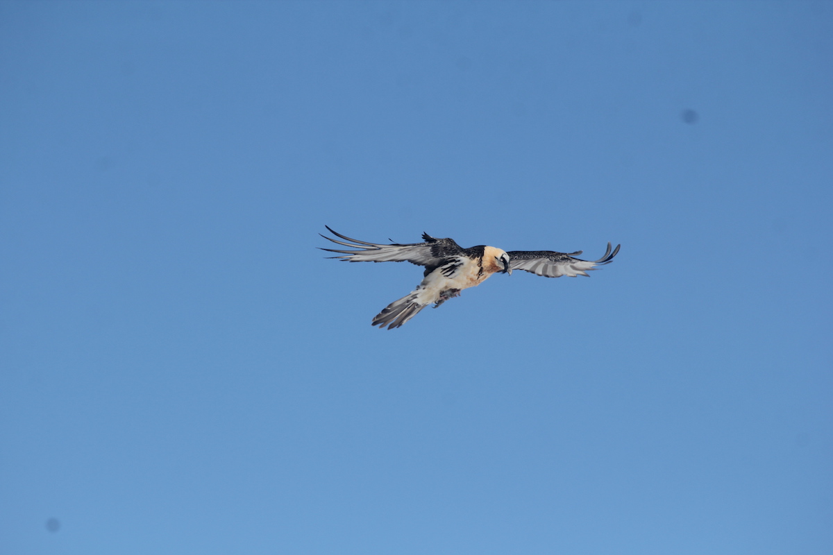 Dann dreht er in hohem Bogen und fliegt praktisch waagrecht daran vorbei. Mit einer Spannweite von bis zu 2,90 Metern handelt es sich beim Bartgeier um den grössten Alpenvogel. Nun ist er schon höher als die begeisterten Naturfotografen. Kaum zu glauben, er landet sogar weiter hinten auf einer Schneefläche. Bald fliegt er wieder davon. Mit einem Knochen in seinen Greiffüssen. Der Wirt des Bergrestaurants legt sie ihm immer mal wieder aus. Das ist denn wohl auch der Grund, warum der Bartgeier so regelmässige auf der Gemmi auftaucht. Er kontrolliert, ob nicht ein Knochen für ihn bereitliegt. Ansonsten fliegt er den Bergflanken entlang. Da ist immer mal eine Gämse abgestürzt, deren Knochen er verspeisen kann.