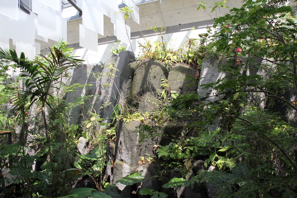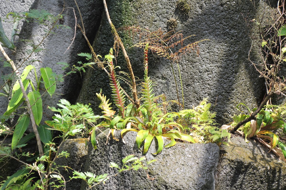 In diesem Urwald gedeihen Gewächse der Neuen Welt wie Bromelien und Anthurien, die als Aufsitzerpflanzen an der Felswand siedeln, wie im echten Wald.
