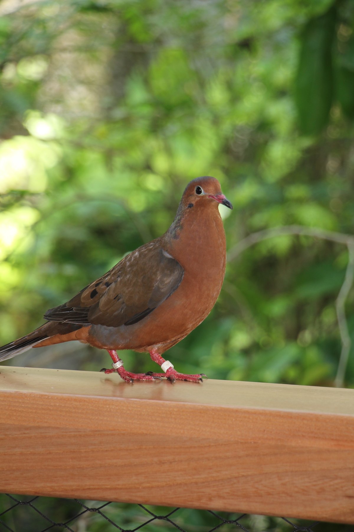 Eine Socorrotaube fliegt auf den Sims, ganz nahe zum Publikum. Sie kam einst ausschliesslich auf der gleichnamigen kleinen Insel vor der Westküste Mexikos vor, doch sie ist dort ausgestorben. Zoos kümmern sich um den Erhalt der Art.