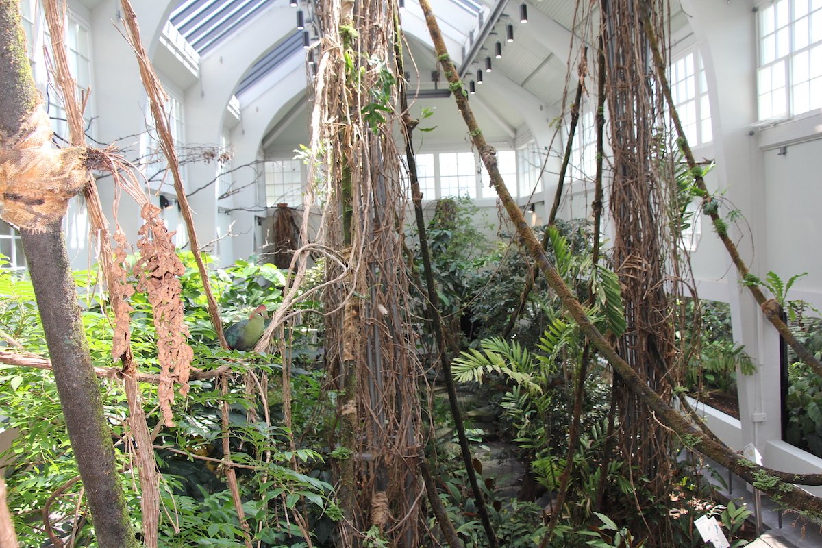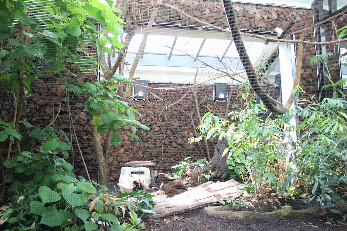 Die Freiflughalle vermittelt einen Eindruck, wie es im Regenwald ist: feucht-heiss, grün, exotisch, abenteuerlich. Erst bei längerem Verweilen entdeckt man die Strausswachteln, die an Boden durch Farnwedel schlüpfen. Doch was sind das für blau schillernde Punkte in grosser Höhe? Anders als im richtigen Regenwald, wo der Mensch an den düsteren Waldboden gebunden ist, haben Besucherinnen und Besucher im sanierten Vogelhaus dank einer Galerie Einblick in die verschiedenen Etagen.