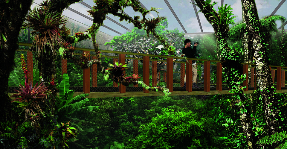 Ein Pfad durch die Baumwipfel des Regenwaldes im Papiliorama! Das ist gar nicht mehr fern, denn das Gebäude Canopea steht bereits. Darin wird sich die Kronenschicht des Regenwalds entfalten, die voller Aufsitzerpflanzen ist. Ein Steg wird durch Bromelien, Orchideen, Farne und Moose führen, hängende Gärten, die von einer Vielzahl von Vögeln und Amphibien bevölkert werden. Im Aussenbereich ist ein Tunnel durch einen grossen Teich geplant.
