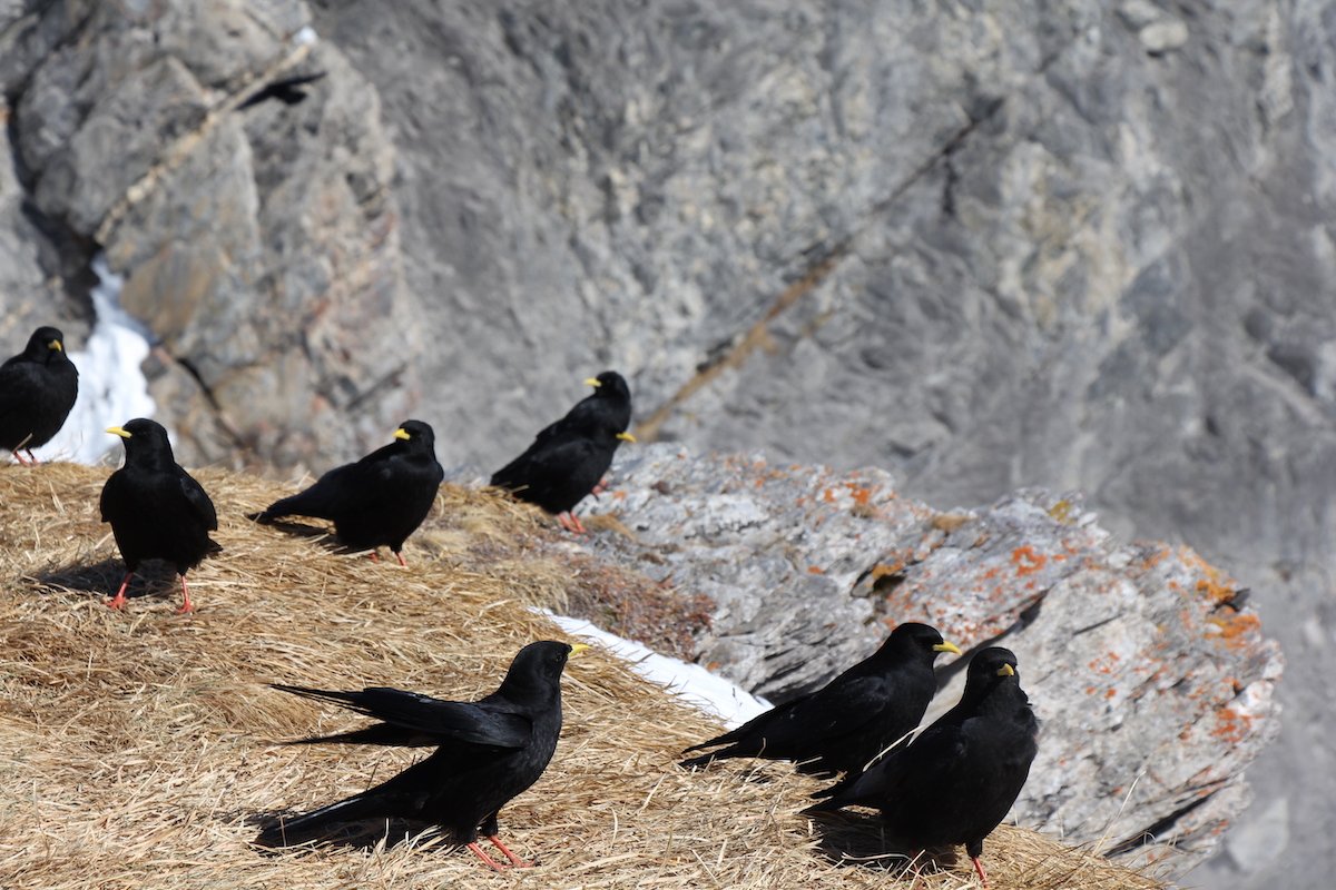 Auch Alpendohlen mit den leicht gebogenen gelben Schnäbeln sind auf die Menschen ausgerichtet, wenn es um Nahrung geht. Wer die Bergbahn auf der Spitze verlässt, ist überwältigt von der Aussicht und macht es sich vielleicht zuerst auf der sonnenbeschienenenTerrasse des Restaurants gemütlich.