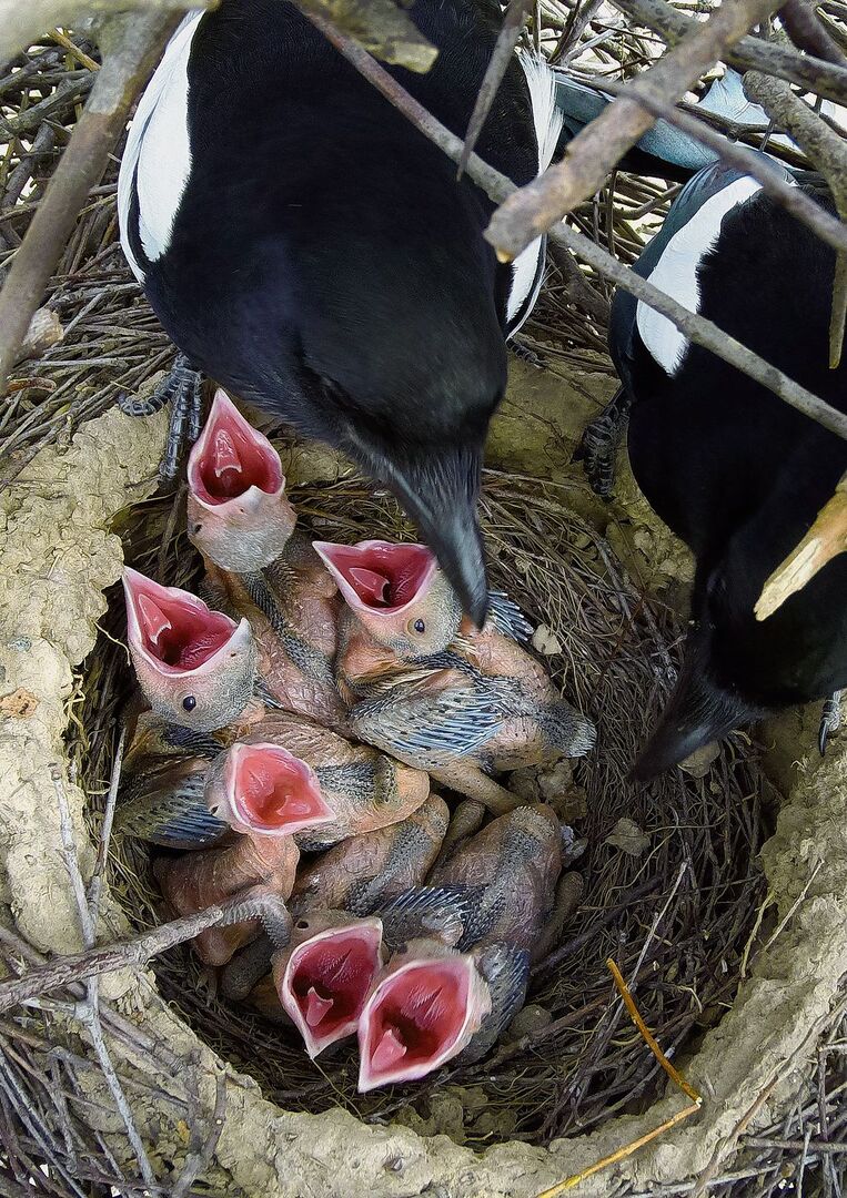 Elisabeth Schlumpf stellt grosse Unterschiede bei der Entwicklung, der Entwöhnung und auch der Selbstständigkeit innerhalb der Familie der Rabenvögel fest. Alle jungen Rabenvögel werden in Gemeinschaft mit Artgenossen oder aber mit anderen Rabenvögeln aufgezogen. «Wir wollen vermeiden, dass sie zu sehr auf den Menschen geprägt sind», sagt die Adoptiv-Vogelmutter. Sie hat beobachtet, dass sich die Elster fast zwei Wochen schneller als die Rabenkrähe entwickelt. «Während junge Krähen lange von den Eltern lernen, werden junge Elstern schneller selbstständig und schliessen sich zusammen.» Elstern legen vier bis acht Eier, die sie während 18 Tagen bebrüten. Die Jungen bleiben 24 Tage im Nest. Im Vergleich dazu legen Rabenkrähen bis zu sechs Eier, bebrüten sie gleich lange, die Jungen verlassen das Nest mit 32 Tagen.
