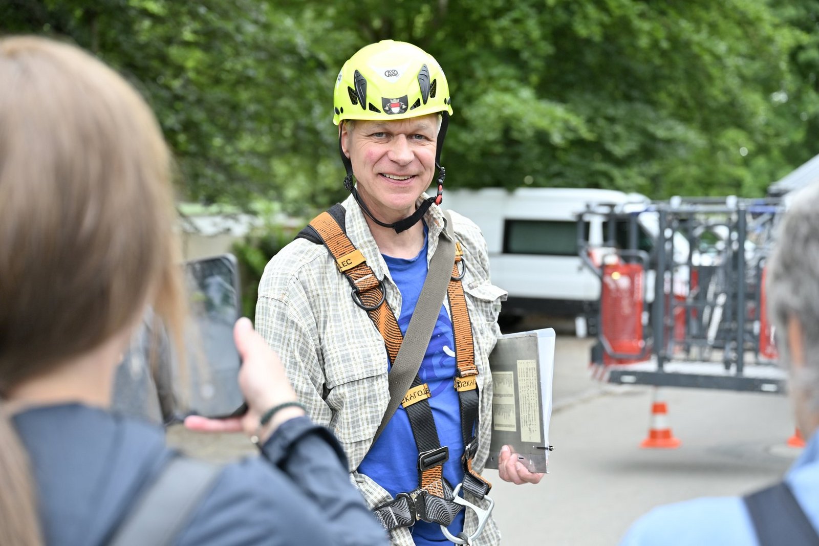 65 Brutpaare besiedeln die Region am Bogen der Aare. Entsprechend viele Horste sind auf den Dächern und in den Bäumen beim Infozentrum Witi zu sehen. Rund um das Feuerwehrauto versammeln sich eine Schulklasse, eine Kindergartengruppe, Mitarbeitende des Infozentrums und Anwohnende. Zahlreiche Augenpaare sind auf den Korb zwischen den Baumwipfeln gerichtet. Sogar Velofahrerinnen und -fahrer stoppen ihre Drahtesel, um zu sehen, was die Feuerwehr da macht.