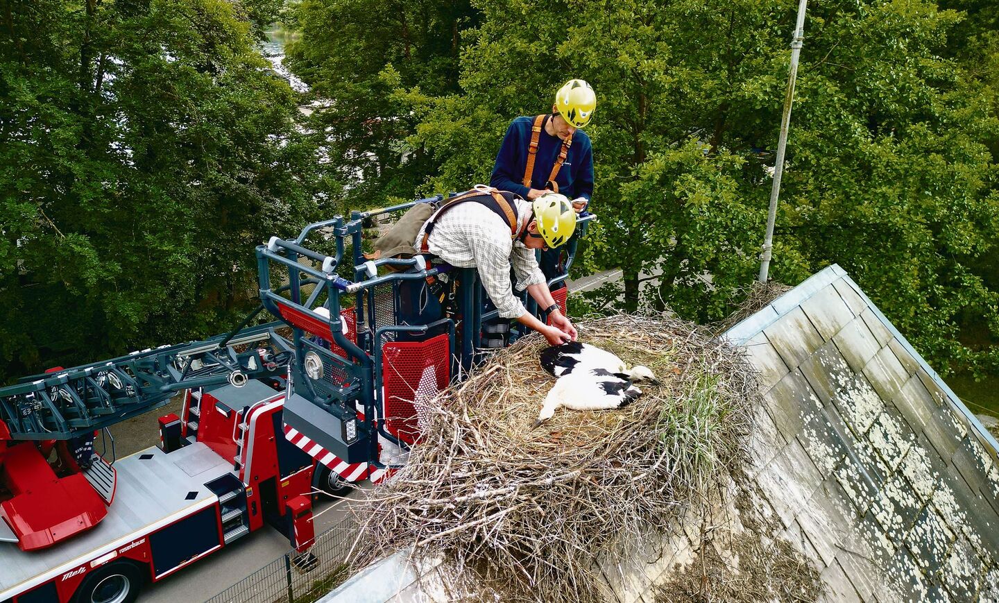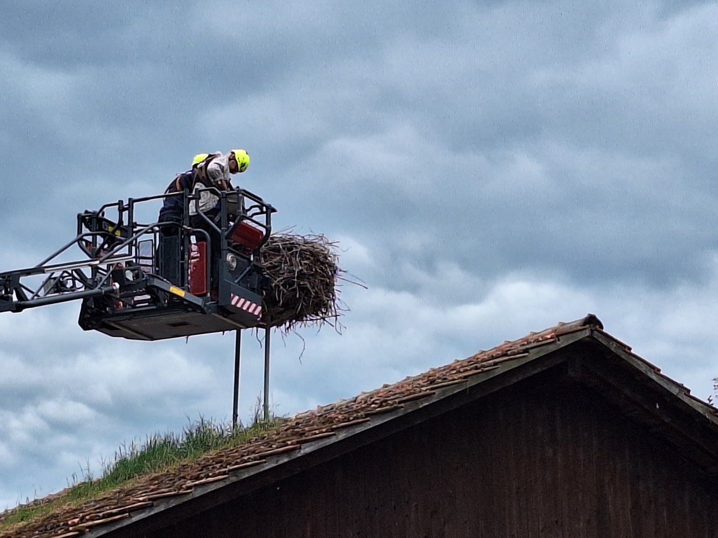 Nach einigen Besprechungsminuten steht der Plan: «Machen wir jetzt die Horste auf dem Kocher-Schopf, dann den auf dem Dach des Restaurants!», so der Tenor der Runde. Feuerwehrmann Daniel Fuchs verschwindet in der Fahrzeugkabine; sein Kollege Tobias Vogt klettert gemeinsam mit dem Beringer wieder in die Kanzel, die erneut in die Höhe gefahren wird – begleitet vom berühmten Storchenklappern.