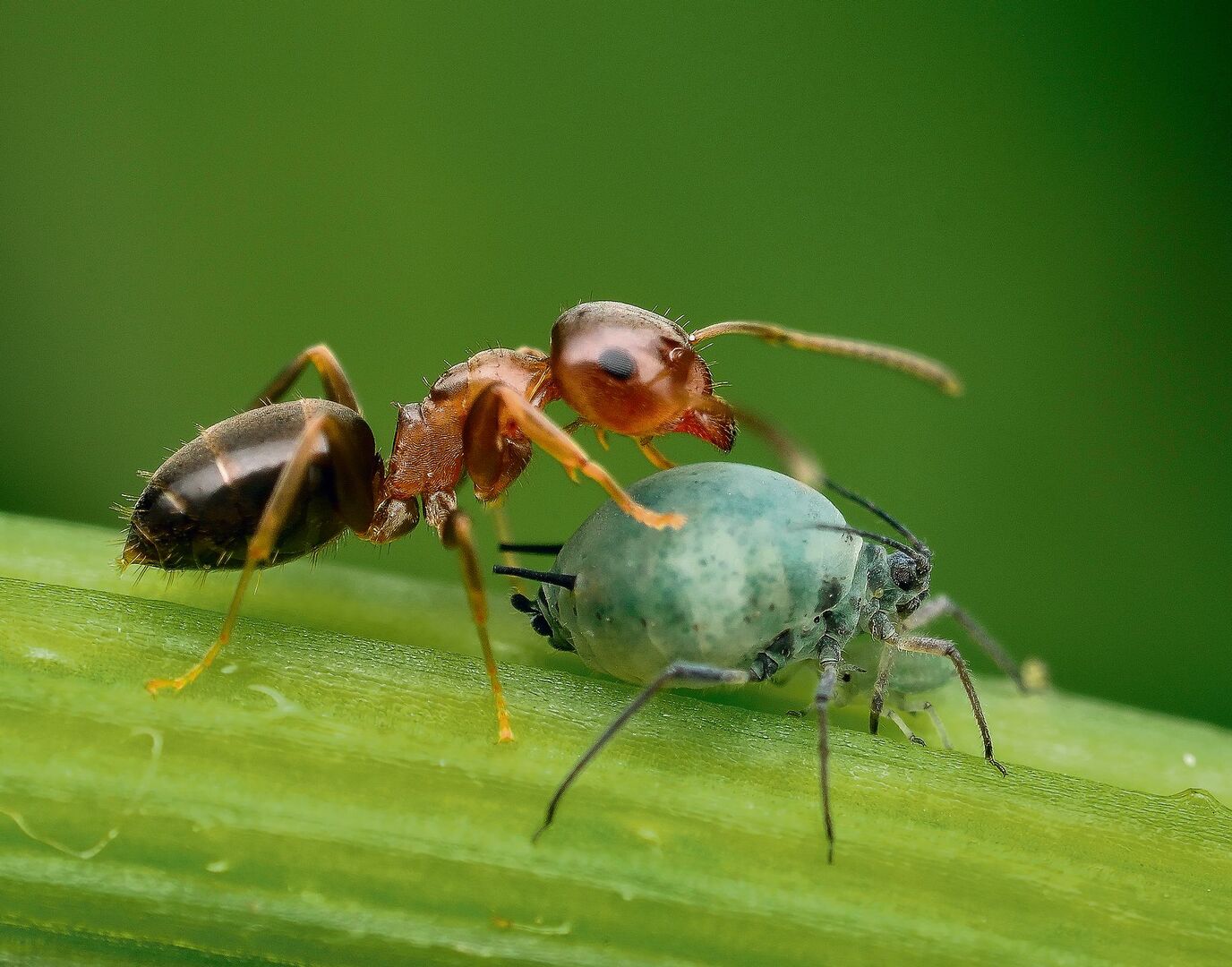 Auch direkt bei uns im Garten kann man eine beeindruckende Symbiose beobachten. Hier beschützten Ameisen winzige Blattläuse vor Fressfeinden wie zum Beispiel den räuberischen Marienkäferlarven. Als Gegenleistung lassen die Blattläuse sich von den Ameisen «melken». Die Läuse stechen die Gefässe der Pflanzen an und saugen deren zuckerhaltigen Saft, was sie bei Gärtnern und Balkonbesitzern äusserst unbeliebt macht. Dieser Honigtau schmeckt auch den Ameisen, und so betasten sie die Blattläuse so lange mit ihren Fühlern, bis diese den süssen Saft am Hinterteil ausscheiden. Entsprechend sind auf durch Blattläuse befallenen Pflanzen auch die Ameisen oft nicht weit.