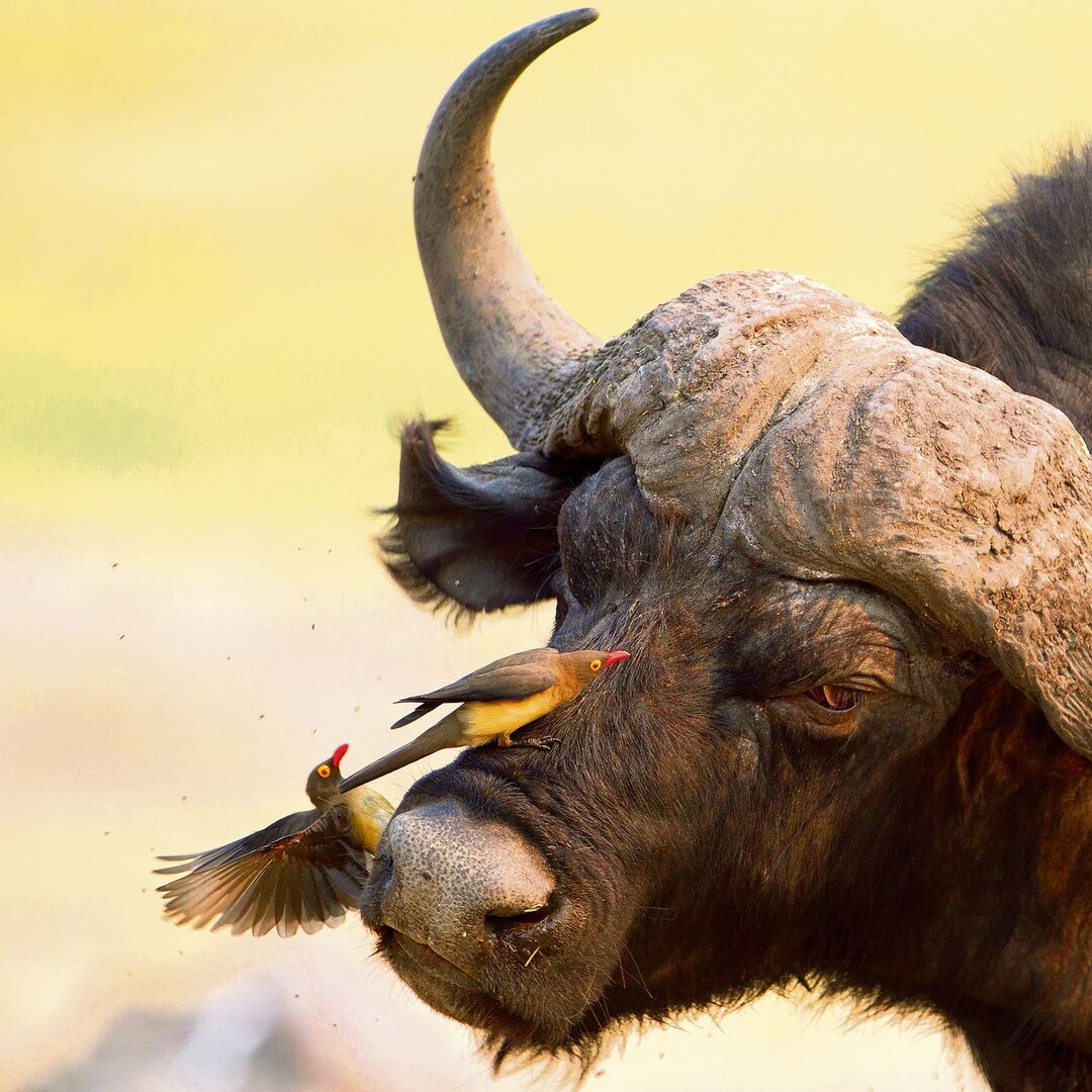 Auch unter Wirbeltieren gibt es Symbiosen zwischen grossen und kleinen Arten. Die Starengattung der Madenhacker befreit afrikanische Weidetiere wie Nashörner und Büffel von Parasiten. Oft sitzen die Vögel in Gruppen auf den grossen Säugetieren und lassen sich von ihnen herumtragen. Nebenbei warnen Madenhacker auch vor herannahenden Raubtieren, was ihnen lokal übersetzt den Namen «Wächter des Nashorns» einbrachte. Allerdings treten immer mehr Zweifel auf, ob die Vögel immer zugunsten der Weidetiere handeln. Beobachtungen zufolge picken Madenhacker auch an den Wunden der Säuger und verhindern deren Heilung.