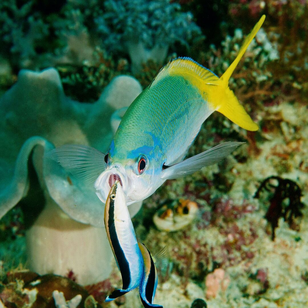 Seinem Namen alle Ehre macht der Putzerlippfisch. Die aus 14 Arten bestehende Tiergruppe hat es sich zur Aufgabe gemacht, andere Fische zu putzen. Dafür unterhalten sie regelrechte Stationen, zu denen andere Fische kommen, um sich von den Putzerfischen von Parasiten und abgestorbener Haut befreien zu lassen, die die Putzerfische ihrerseits fressen. Als Erkennungsmerkmal dienen den «Kunden» die auffallenden Längsstreifen der Putzerfische. Selbst Raubfische verhalten sich an den Putzerstationen friedlich und warten, bis sie an der Reihe sind. Selbst ins Maul und in die Kiemenhöhle schlüpfen die Fischlein, was von den anderen Fischen nicht nur geduldet, sondern sogar erwünscht ist.