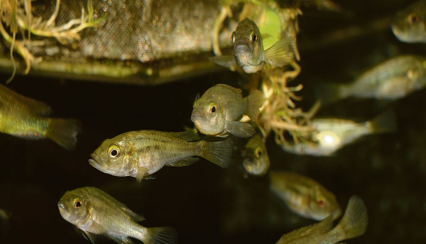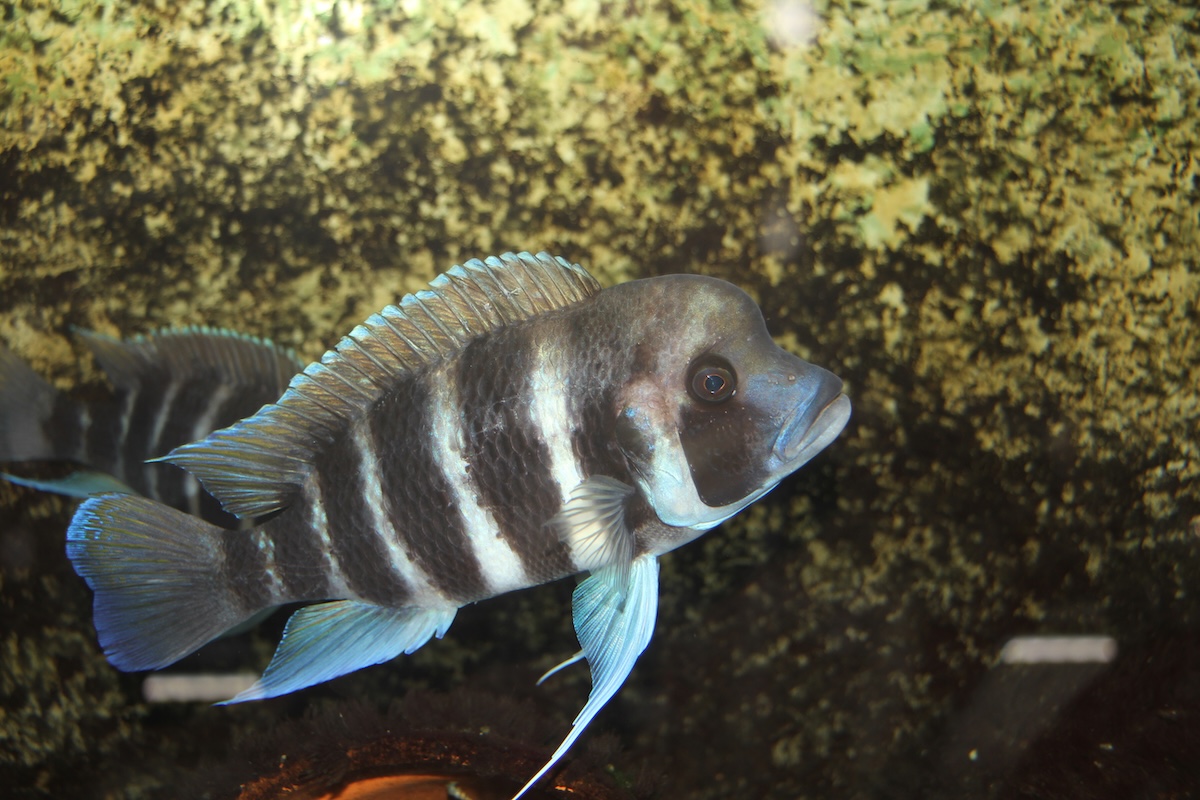 Fabrizia Ronco forscht über Buntbarsche aus dem Tanganjikasee, die in einem unglaublichen Artenreichtum vorkommen. Während der schlangenähnliche Lungenfisch das Geschehen im Flur des Universitätsgebäudes zu beobachten scheint, schwimmen auf der anderen Seite der Bürotür der Zoologin vitale, dunkle Fische mit bläulich schillernden Schuppen in einem Grossaquarium. Sie sind eher mit sich selbst beschäftigt. «Gnathochromis permaxillaris zeichnet sich durch sehr bewegliche Kiefer aus, die er trichterartig vorstülpen kann, um damit kleinste Lebewesen von Substrat zu saugen», kommentiert die Fischforscherin das Verhalten dieser Buntbarsche aus dem Tanganjikasee.