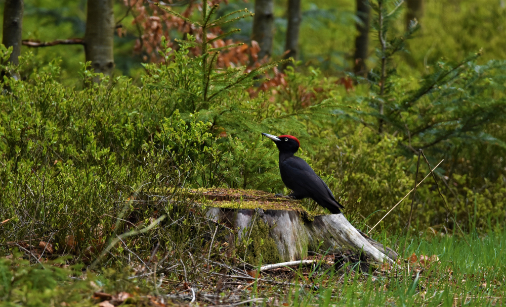 Plötzlich trällert eine helle, klare Stimme aus dem Tannenwald. Ein Schwarzspecht! Kurz darauf fliegt er in Wellenlinien an einen Wurzelstock, meisselt auf das halbmorsche Holz und findet vermutlich Kerbtiere.
