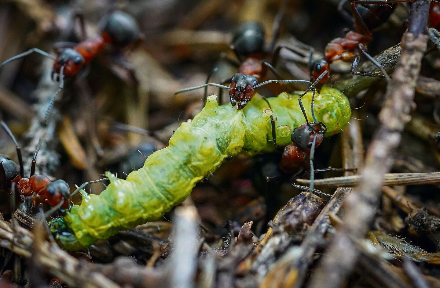 Damit beantwortet der Forstingenieur und ehemalige Kantonsförster des Kantons Schwyz auch die Frage nach einem weiteren ökologischen Nutzen der Insekten: Sie dienen anderen Tieren als Nahrung. Um sich gegen das Gefressenwerden zu wehren, besitzen Waldameisen Drüsen, über die sie Ameisensäure zur Verteidigung einsetzen können. Mit diesem ätzenden Gift können Ameisen Feinde in bis zu einem Meter Entfernung besprühen. Einigen Vogelarten dient die Ameisensäure jedoch auch als aggressives Reinigungsmittel. So setzen sich insbesondere Eichelhäher mit ausgebreiteten Flügeln auf Ameisenhaufen, um sich von den Insekten mit Ameisensäure besprühen zu lassen. Dieses sogenannte Einemsen soll dazu dienen, Parasiten vom Gefieder fernzuhalten.