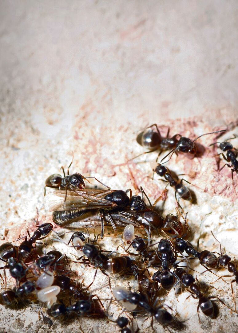 Die schwarze InvasionEigentlich ist die Grosse Drüsenameise (Tapinoma magnum) im Mittelmeerraum heimisch. Durch den Pflanzenhandel wurde sie jedoch auch in die Schweiz eingeschleppt. Die kleine, schwarze Ameise lässt sich von einheimischen Arten lediglich durch den grossen Grössenunterschied (Polymorphismus) bei den Arbeiter-innen unterscheiden.