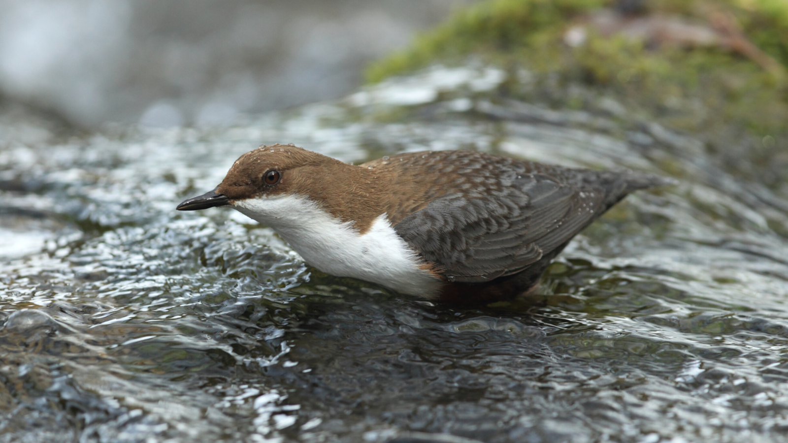 Die Wasseramsel ist der einzige Singvogel, der auch tauchen und sich auf dem Grund der Gewässer fort-bewegen kann. Sein dichtes Gefieder isoliert optimal. Bei der Jagd blitzt am schieferfarbenen, fliessenden Wasser plötzlich etwas Weisses auf: Die Brust der wippenden Wasseramsel. Nun fliegt sie knapp über die schäumende Wasseroberfläche auf einen anderen Stein, hält dort kurz inne und stürzt sich dann in die Fluten. Sie ist einfach verschwunden, auch bei winterlicher Kälte, bis sie unvermittelt ganz woanders wie ein Korken aus dem Wasser schiesst und auf einen Stein flattert. Ihr Gefieder zeigt sich makellos.