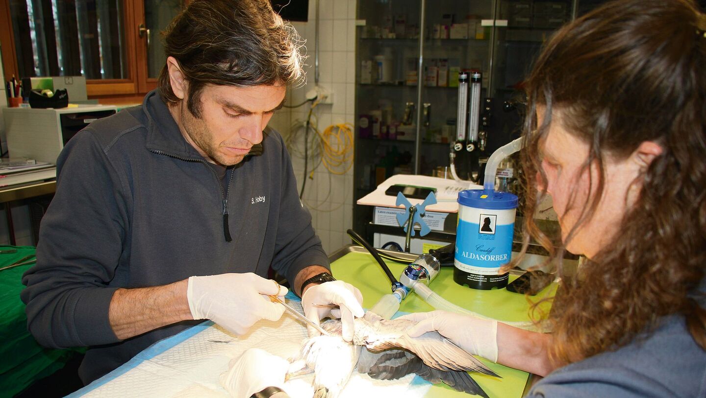 Warum sich in Bern die Stadttauben konstant auf einem Bestand von gut 1000 Vögeln halten, zeigt sich an einem grauen Wintervormittag in einem unscheinbaren Raum hinter dem Vivarium des Berner Tierparks. Dort beugen sich Dr. Stefan Hoby und Iris Baumgartner über eine Taube. Sie liegt bewegungslos auf einem Behandlungstisch. Mit einem Endoskop schaut der Veterinär ins Innere des Vogels, die Tierpflegerin hält sie fest. Das Taubenköpfchen liegt in einer Plastikglocke und inhaliert ein Anästhetikum. Vorher hat der Tierarzt dem Vogel seitlich wenige Federn ausgerissen und ein Schmerzmittel verabreicht. «Aha, es ist ein Männchen», murmelt er. Der Veterinär durchtrennt den Samenleiter und näht mit wenigen Griffen die kleine Wunde zu. Die Tierpflegerin nimmt den Täuber vorsichtig in die Hand, während der Tierarzt an einem Fuss einen Ring mit einer Nummer, am anderen einen weissen Plastikring überzieht. Der weisse Ring weist den Täuber künftig als Bewohner des Schlags Nydeggkirche aus. Meret Huwiler trägt die Angaben in ein Buch ein. Sie sagt: «Jede Taube, die wir untersuchen und beringen, ist hier vermerkt.» Als der Täuber auf der Waage liegt, zuckt er mit den Flügeln, kurz darauf wacht er in seiner Boxe auf und blickt verwundert zum Gittertürchen hinaus. «Ein Riesenexemplar», kommentiert Stefan Hoby das Gewicht von 394 Gramm.
