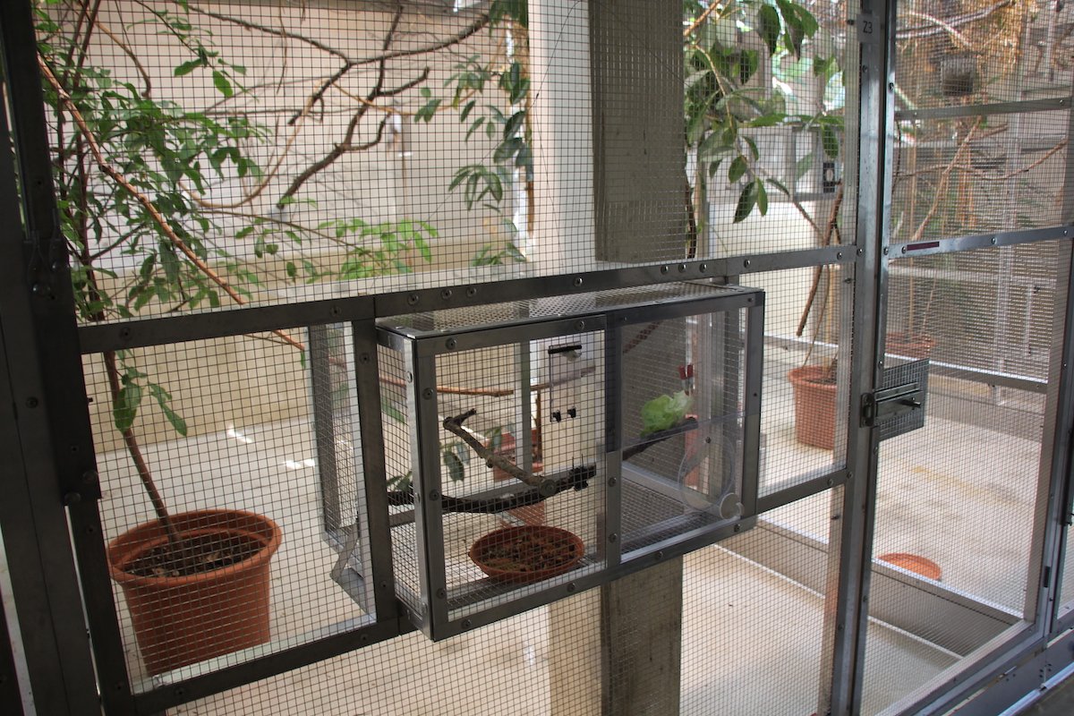 Eine Spezialität des Vogelpflegers Burkhard Monsch ist auch das stressfreie Fangen der Vögel in den Zuchtvolieren. Die Arten werden in Käfigen am Frontgitter gefüttert. Sie sind es sich gewöhnt, dort hineinzufliegen. Der Aufenthalt im kleinen Käfig ist für sie positiv behaftet, denn sie finden Nahrung. Muss ein Vogel versetzt werden, kann dieser Käfig mit einem Zugsystem, bestehend aus Fäden oder gar von Weitem automatisch mit einem Schliesssystem, wie es für Autotüren verwendet wird, geschlossen werden. Der Vogel kann darin rasch und schonungsvoll gefangen werden und muss nicht in der Voliere herumgejagt werden.