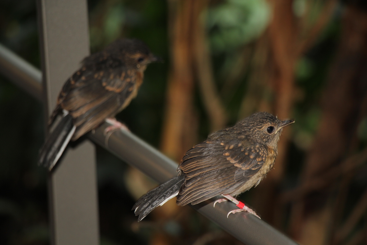 Ebenso stammen die Omeihäherlinge aus China und sind gefährdet. Auch sie teilen sich den Lebensraum in der Basler Freiflughalle mit all den anderen Arten, haben Nester gebaut und Junge aufgezogen. «Bei dieser Art können die Jungen noch bis im Frühling in der Halle bleiben, dann werden sie von den Eltern weggejagt», gibt Jess Borer zu bedenken. Wenn Junge ausfliegen, sind sie noch unbeholfen. Das ist der Moment, wo sie vom erfahrenen, langjährigen Vogelpfleger Burkhard Monsch kurz gefangen und mit einem Farbring gekennzeichnet werden. So können die Individuen identifiziert werden. Muss der Tierpfleger Altvögel aus der Halle fangen, gelingt dies in abgesonderten Käfigen, wo die Vögel hineinfliegen, um Futter aufzunehmen. Junge der Schamadrossel, die vom Geländer aus ihre Eltern anbetteln, müssten bald entnommen werden. «Diese Art beachtet den Nachwuchs rasch als Konkurrenz», erklärt Jess Borer.