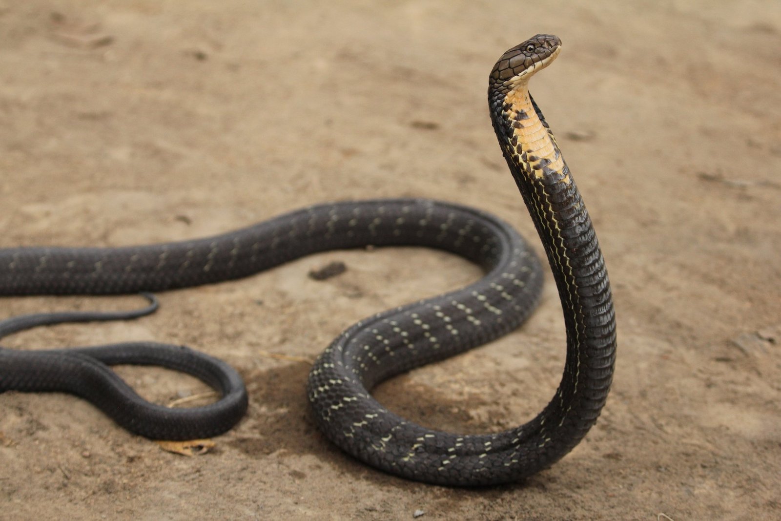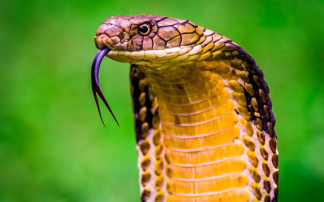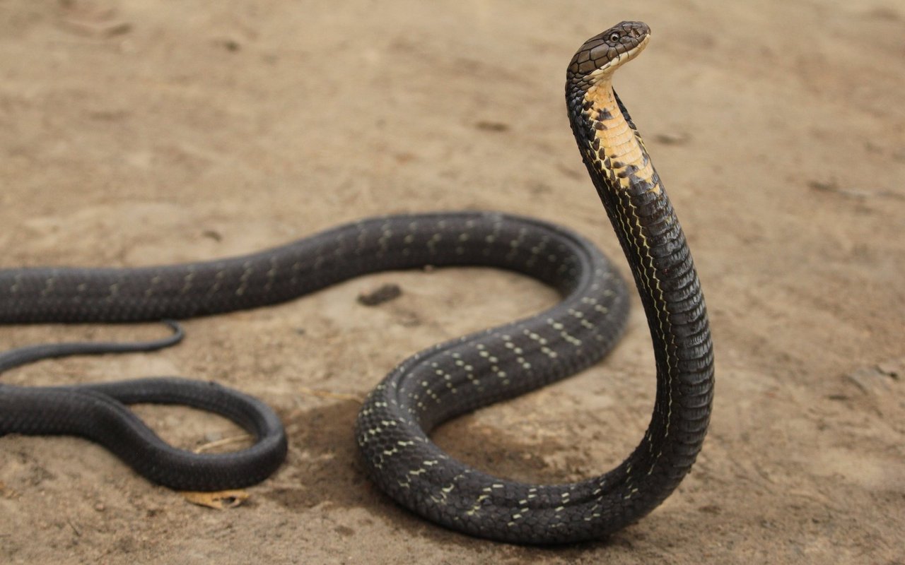 Die Königskobra ist die längste Giftschlange der Welt und kann bis zu 5,4 m lang werden. Dank ihres beeindruckenden Sehvermögens kann die Schlange einen sich bewegenden Menschen aus einer Entfernung von fast 100 Meter sehen. Wenn sie sich bedroht fühlt, nutzt eine Königskobra spezielle Rippen und Muskeln in ihrem Hals, um ihre «Kapuze» oder die Haut um ihren Kopf herum aufzublasen.