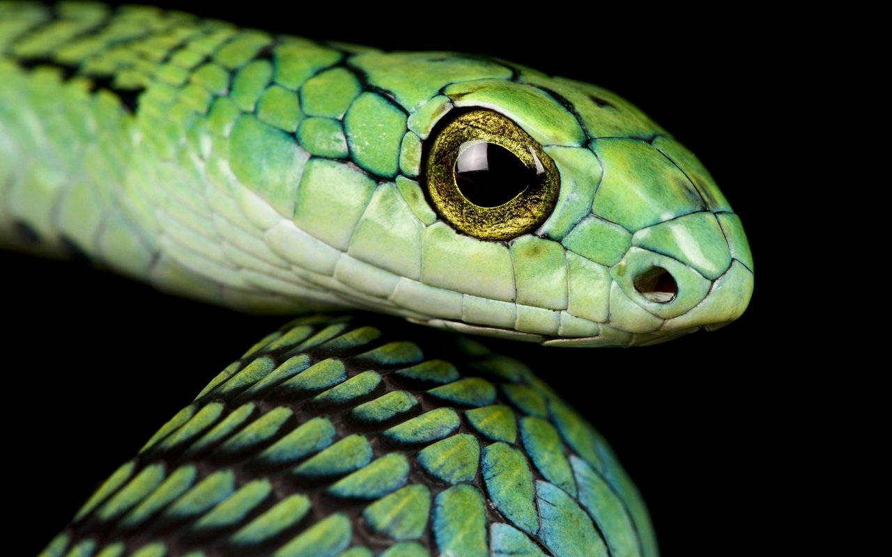 Die Boomslang oder auch Afrikanische Baumschlange genannt, kommt in ganz Afrika vor, aber vor allem in Swasiland, Botswana, Namibia, Mosambik und Simbabwe. Mit ihrem eiförmigen Kopf, den übergrossen Augen und dem hellgrün gemusterten Körper ist die Boomslang recht ansehnlich. Sie ist eine der giftigsten Schlangen mit sogenannten hinteren Zähnen. Diese Schlangen können ihre Reisszähne in ihr Maul zurückklappen, wenn sie nicht gebraucht werden. Wie andere tödliche Schlangen hat auch diese ein hämotoxisches Gift, das ihre Opfer innerlich und äusserlich verbluten lässt.