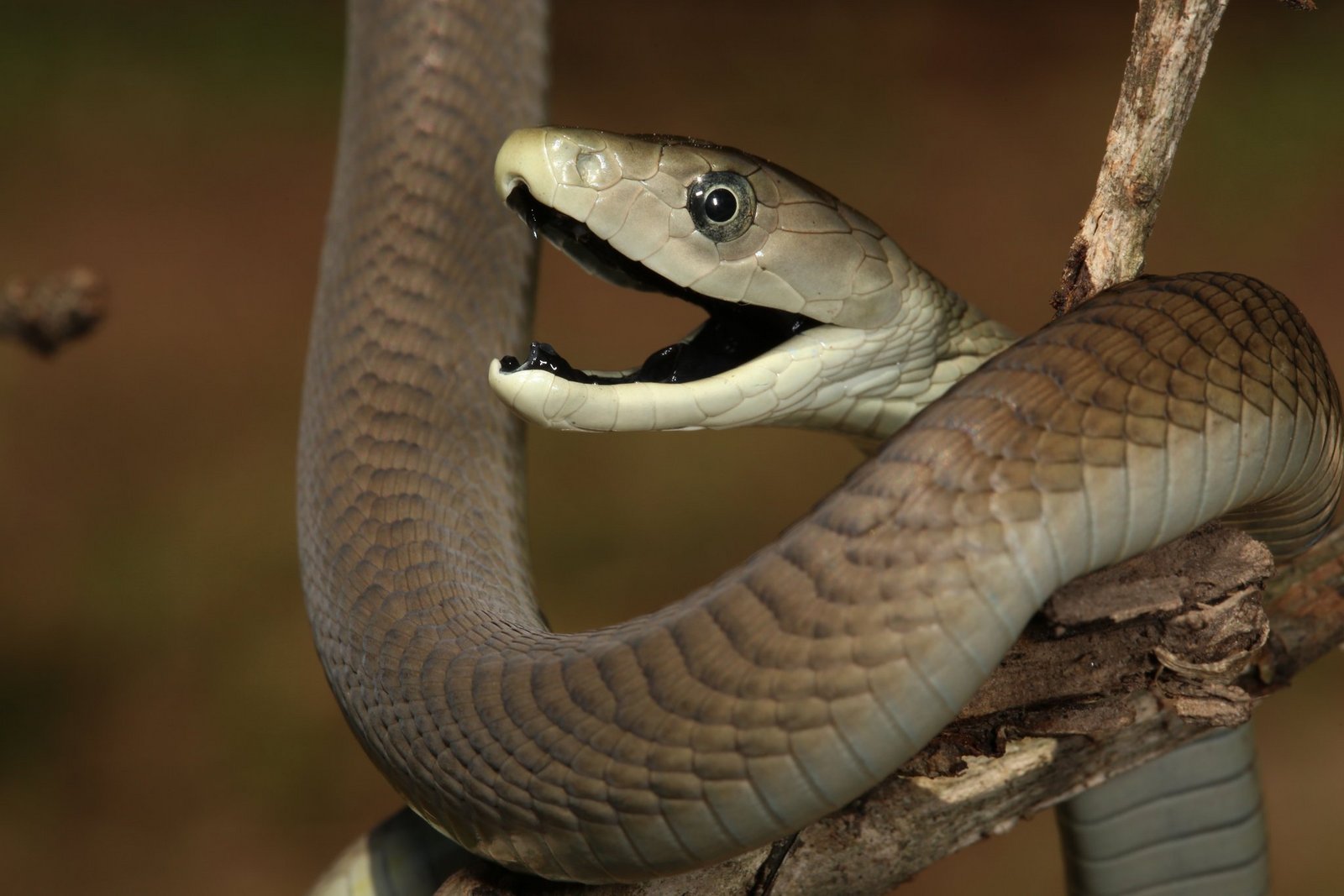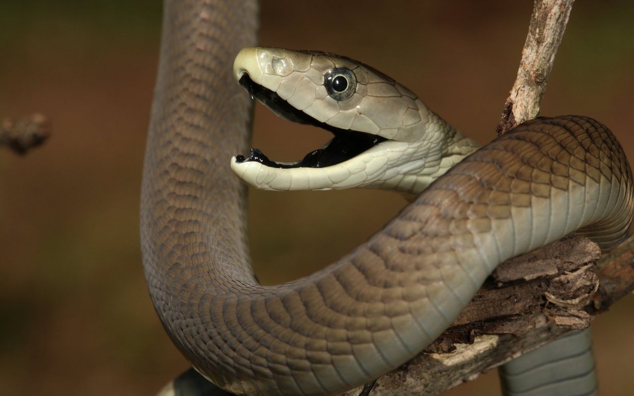 Die Schwarze Mamba ist Afrikas tödlichste Schlange und kann einen Menschen mit nur zwei Tropfen Gift töten. Benannt nach der dunklen, tintenähnlichen Farbe im Inneren ihrer Mäuler, sind schwarze Mambas eigentlich bräunlich. Sie sind durchschnittlich 2,5 Meter lang und können sich mit einer Geschwindigkeit von 19 km/h bewegen.