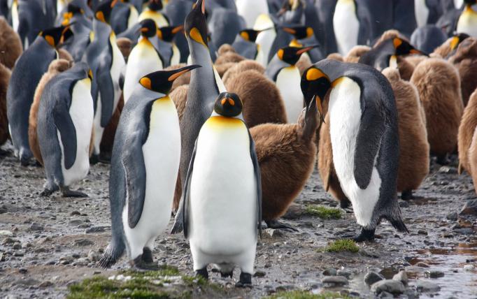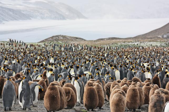Auf Königspinguine, nach den Kaiserpinguinen die zweitgrösste Art, trifft man in der Fortuna Bay in Südgeorgien. Sie legen nur ein Ei und bauen anders als die Adélies keine Nester, sondern verwahren das Ei auf ihren Füssen. Wenn die Jungen geschlüpft sind, verwandelt sich die Bucht in ein Meer von Tausenden flauschigen braunen Jungtieren, die wie Teewärmer oder alte russische Männer in einem zu grossen Pelzmantel aussehen. Dicht an dicht gedrängt trotzen sie dem Schneetreiben. Pinguine so weit das Auge reicht. Kaum vorzustellen, dass eine Mutter hier ihr Junges allein an der Stimme wiederfinden kann.