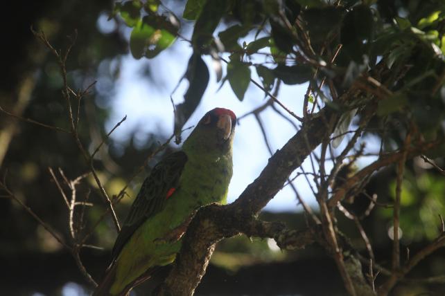 kt gebannt empor und zeigt verhalten in die Äste einer Steineibe. Jetzt sehe ich sie auch! Ein Ast wippt im leichten Wind, dahinter ziehen graue Wolken durch und geben blauen Himmel frei. Am Ast turnt ein kompakt wirkender, grüner Papagei mit oranger Stirn. Es ist ein Reichenows Kongopapagei! Er hat es auf die reifen, roten kleinen Beeren des Baumes abgesehen, die überall an den äusseren Ästen reifen. Etwa sechs Exemplare machen wir aus, die im Baum turnen, alle darauf erpicht, von den Früchten zu fressen. Einmal fliegen zwei Tiere auf einen kahlen Baum unterhalb unseres Standortes, verschwinden dann aber schnell wieder im Grün der Steineibe. Brillenvögel huschen den Ästen entlang, wohl auf der Suche nach Läusen.