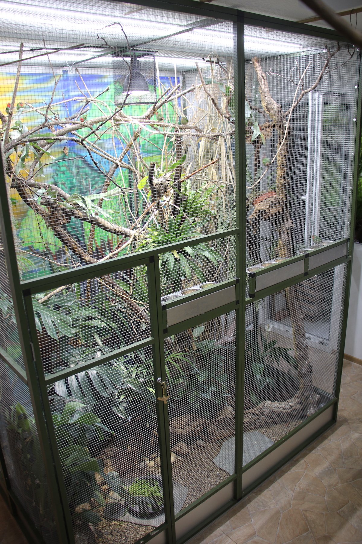 Ein Lebensraumausschnitt lässt sich am besten in einer Zimmervoliere nachbauen. Volierenbauer fertigen sie nach Mass und mit Bodenplatte an. Vorher sollte über der Voliere eine Beleuchtung angebracht werden. Auch wenn Licht durch das Fenster einfällt, ist eine zusätzliche künstliche Beleuchtung essenziell. Nur so gedeihen Pflanzen gut und die Vögel lassen sich einwandfrei beobachten. Durch den Lichteinfall von oben tritt zudem das trennende Gitter optisch in den Hintergrund. Die Grundbeleuchtung sollte mit LED in der Lichtfarbe von 6500 Kelvin erfolgen. Das entspricht dem Tageslichtspektrum. Zusätzlich sollte innerhalb der Voliere eine Vogellampe angebracht werden, die Wärme und ultraviolettes Licht abgibt. Vögel im Innenbereich sollten die Möglichkeit haben, ultraviolette Strahlen in Verbindung mit Wärme aufnehmen zu können. Nur so können sie im Körper gewisse Vitamine aufschliessen.