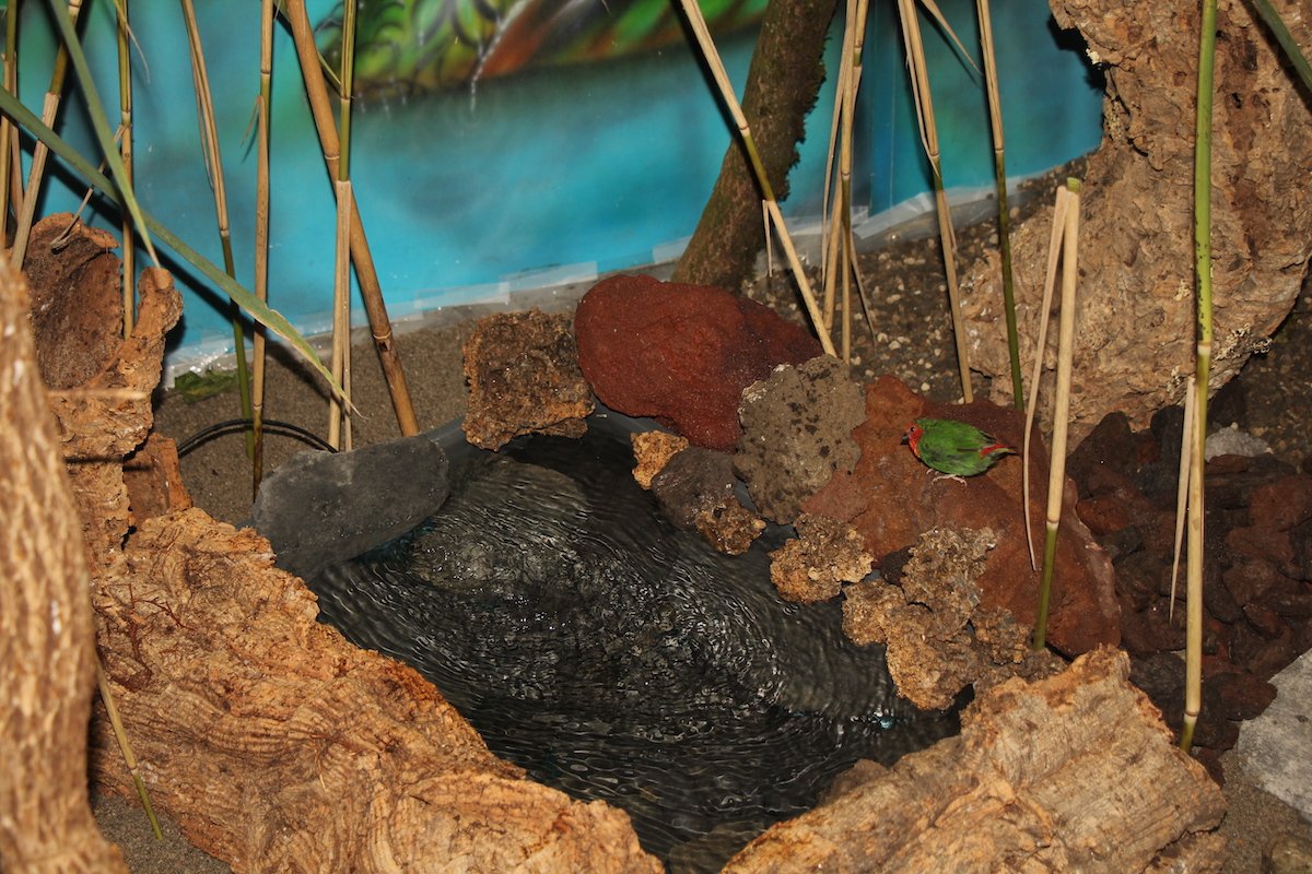 Ob Regenwald oder Savanne, ein Wasserbassin brauchen alle Vögel. Mit einfachen Mitteln lässt sich ein natürliches Bassin nachbilden. Aus einer flachen, viereckigen Kiste aus dem Baumarkt wird rasch ein natürliches Vogelbad. Das geht so: Eine dicke Lage Schaumstoff aus dem Zoofachhandel am Boden, darüber werden dünne Schieferplatten gelegt. Der Rand wird mit Steinen, Wurzeln und Pflanzen ausgekleidet. So verliert sich die ursprüngliche viereckige Form. Ein Kopf eines Aquarienfilters, der in den Schaumstoff eingefügt wird, sorgt für Wasserbewegung. Denn plätscherndes Wasser stimuliert die Vögel, regt sie zum Baden und sogar zur Brut an.