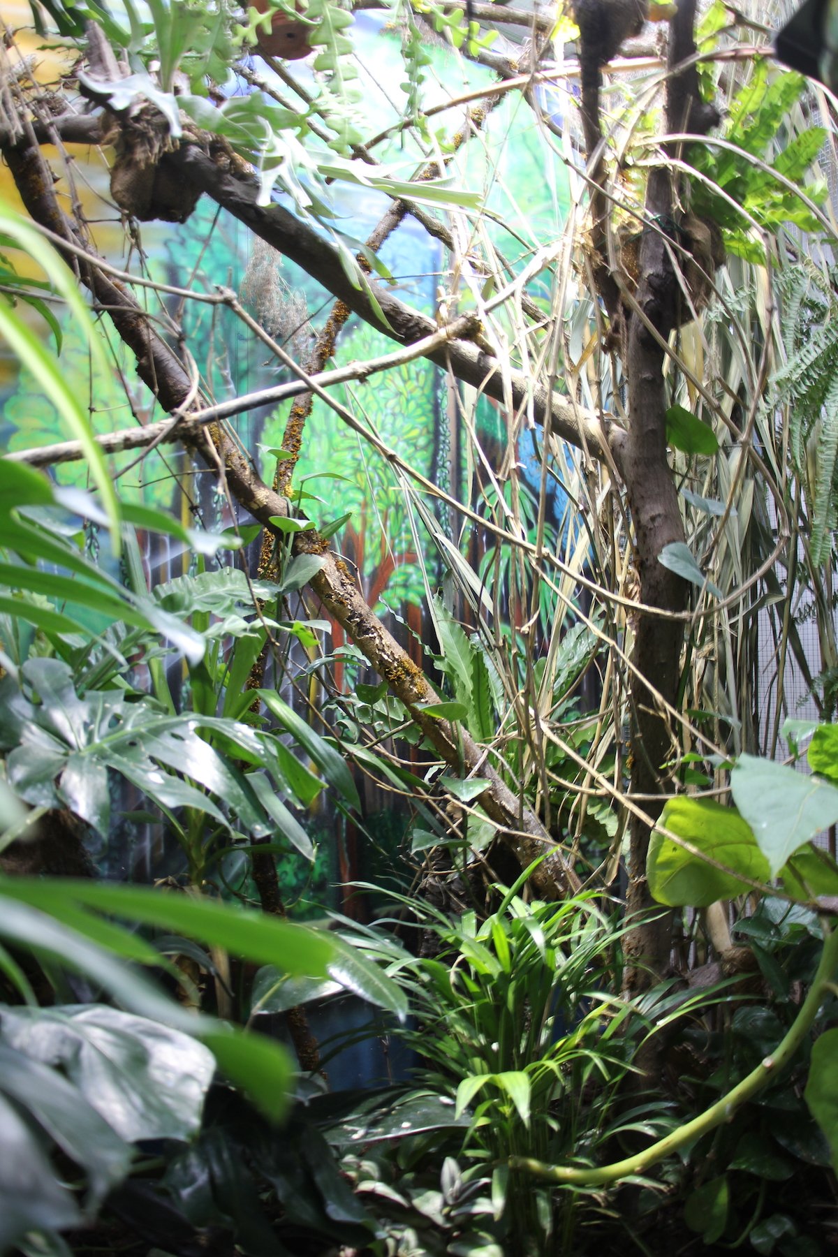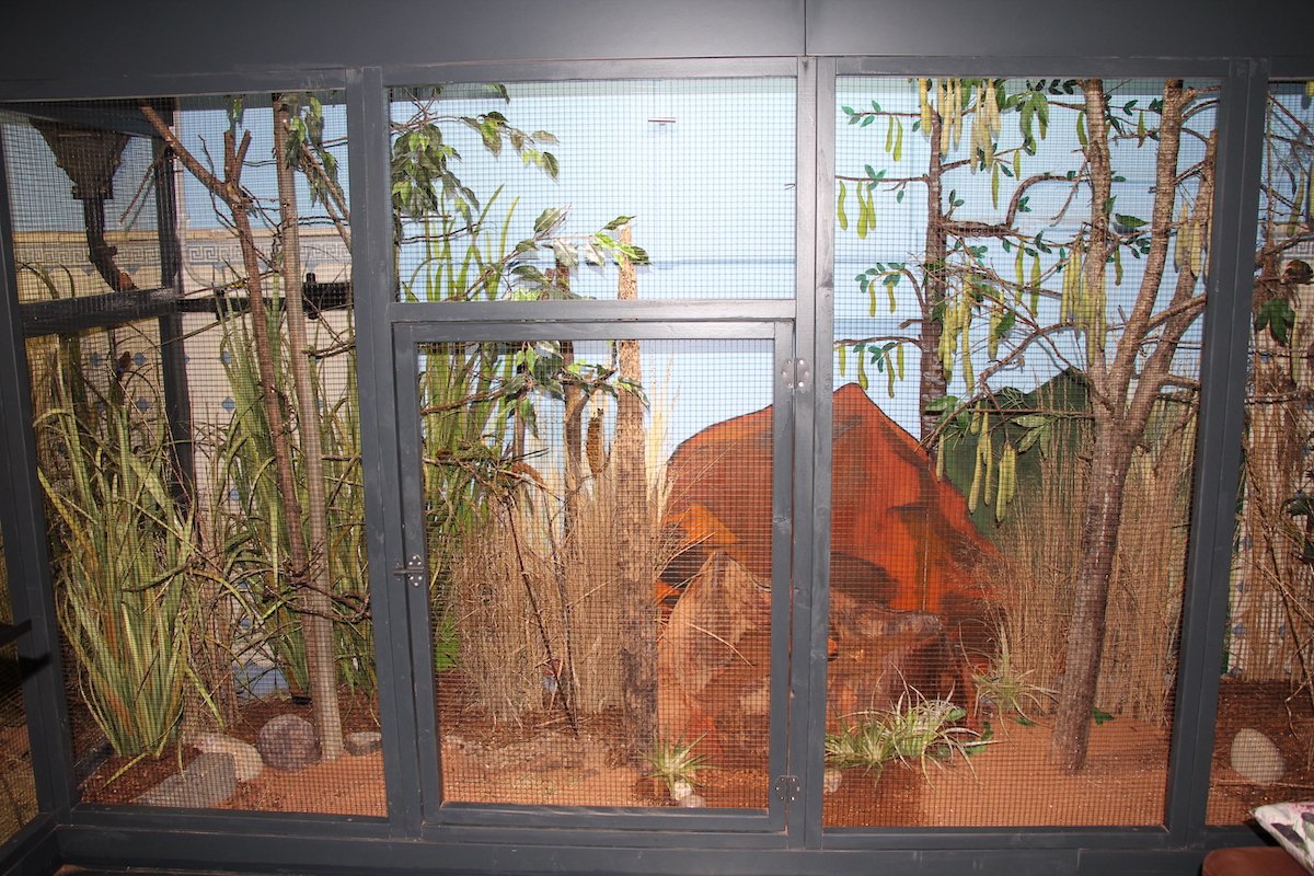 Zu einer gelungenen Biotopvoliere gehört auch die passende Rückwand. Entweder, die Savannenvegetation zieht sich auf einem Bild weiter, so wie das Thomas Wallimann gestaltet hat, oder aber, die Rückwand ist gelblich oder hellblau getönt, sodass der Blick ins Weite schweift. Bei einer Regenwaldvoliere eignen sich Bilder mit Pflanzenvegetation, entweder gemalt oder als Fotos gross aufgezogen. Das Rückwandbild sollte die Szenerie in der Voliere aufnehmen. So bildet sich optische Weite.