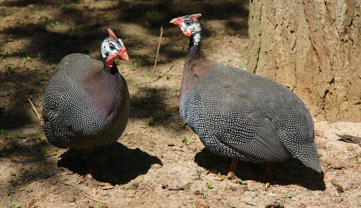 Nach Afrika eintauchen und zeternde Helmperlhuhn-Gruppen erleben kann man auch im Zoo Basel. Auf der Elefantenanlage ist nämlich oft ein Spektakel, nicht wegen der Rüsseltiere. Da flattern und zetern zahlreiche Helmperlhühner über den sandigen Boden. Da sie nur wenig fliegen, beanspruchen sie auch die angrenzenden Bereiche für sich und brüten gar in der dichten Vegetation. Die Weibchen tun dies meist alleine, doch beide Elternteile führen die Jungen, bewachen sie und zeigen ihnen das Futter. Nach zwei Monaten schliesst sich die Familie wieder dem Trupp an. Im Zoo Basel gelingt regelmässig die Elternaufzucht.