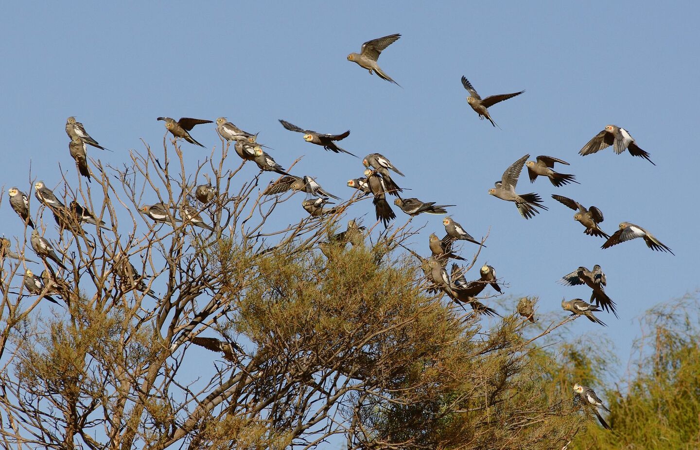 Sie waren viel zu weit weg, als dass es gute Bilder gegeben hätte. Gleich war es mit Nymphensittichen, einem bekannten Volierenvogel, von dem aber kaum Bilder aus dem Freiland bekannt sind. Ich wollte sie unbedingt fotografieren. Wir schlugen uns ins Feld, kletterten über Stacheldrahtzäune, versteckten uns unter Büschen, bis uns Bilder von Wellen- und Nymphensittich-Schwärmen im Freiland gelangen.