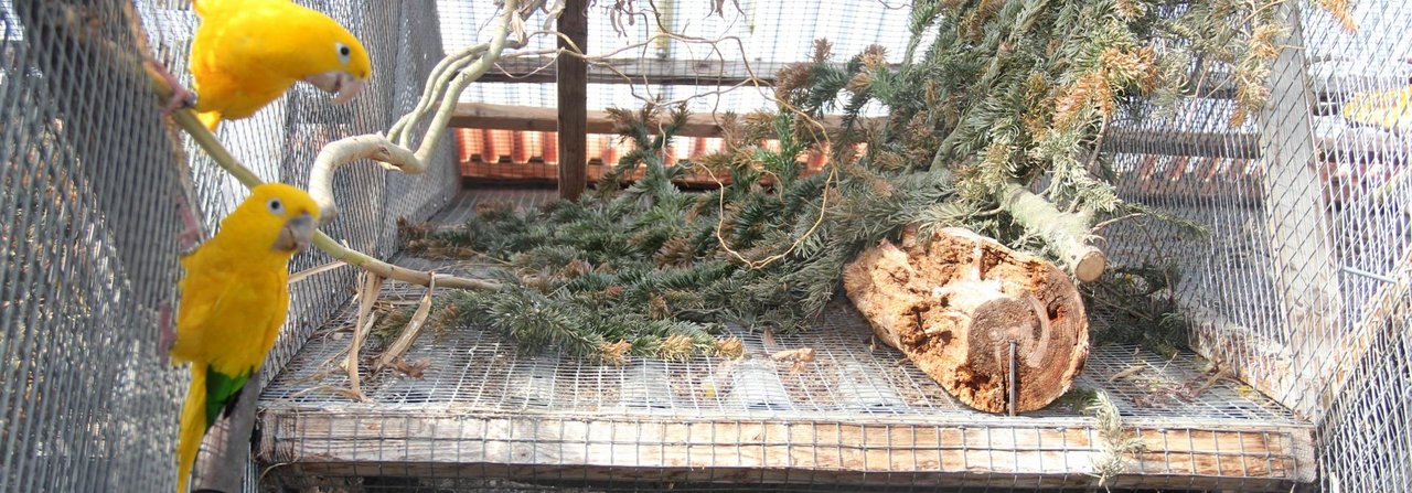 Die warme Jahreszeit macht sich bemerkbar. Zeit, die Aussenvolieren nicht nur zweckmässig, sondern auch attraktiv einzurichten. Zum Beispiel mit Stöcken, Zweigen und Steinen.