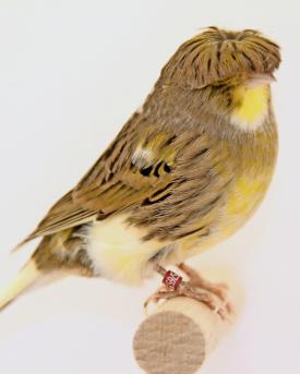 Unter den Kanarien gibt es auch Eidgenossen, der Frisé Suisse etwa. Dabei handelt es sich um eine frisierte Rasse, das heisst, dass das Gefieder Frisuren zeigt. Die Brustfedern beispielsweise formen ein Körbchen. Dieser Vogel fliegt so gut wie glatt befiederte Rassen, die Brutbiologie unterscheidet sich nicht von den übrigen Rassen. Um 1900 etablierten Züchter diese Kanarienrasse in der Region Basel. Sie nimmt die Haltung eines Halbmondes ein.