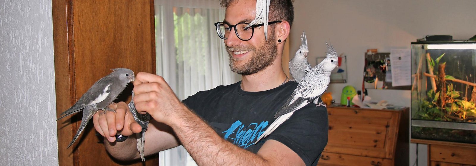 Arnold fliegt derweil im Zimmer im Kreis, Dokrates bettelt auf dem Tisch nach Futter und Caspar flattert auf einen Ficus, der daraufhin scheppernd zu Boden fällt. Bettina Eisenring lacht. Manuels Mutter ist sich allerhand gewöhnt: Für sie sind die gefiederten Mitbewohner seit langem normal, fuhr Sohn Manuel doch schon als Kleinkind auf dem Dreirad durch die Wohnung mit gefiederten Passagieren. Auf der Lenkstange sassen ein Wellen- und ein Nymphensittich.