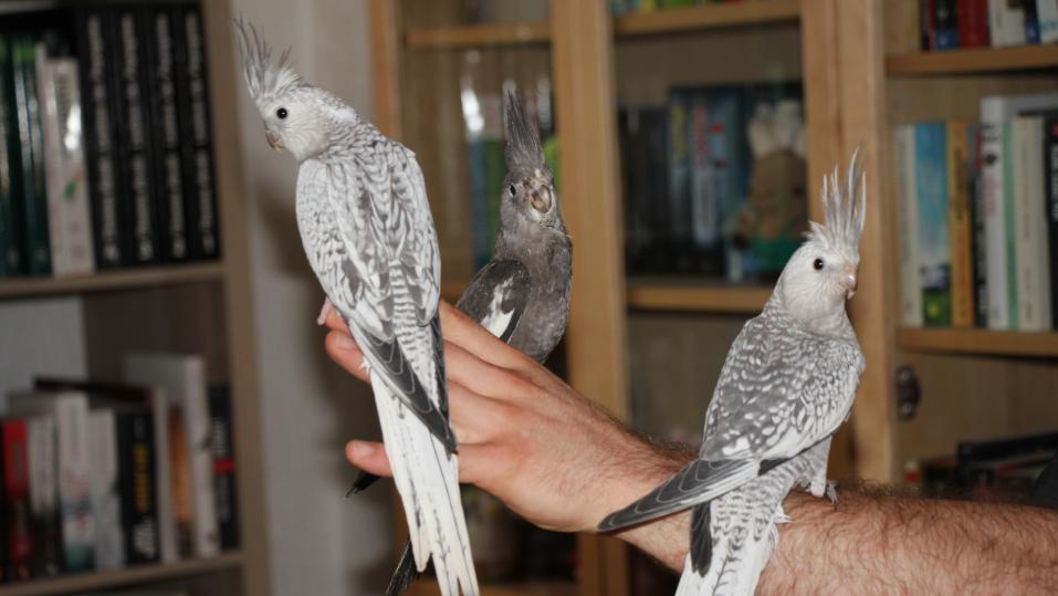Nymphensittiche aber stammen aus offenen Gebieten Australiens und sind pfeilschnelle Flieger. Darum übt Eisenring vorerst ausschliesslich in der Wohnung mit ihnen. Auch im Zimmer zeigen sie dieses Verhalten: Sie fliegen auf und stürzen davon. Der kleine Zitronensittich aber bleibt auf dem Büchergestell sitzen und äugt hinunter zu Eisenring. Es braucht einige Zeit, bis sich die Australier-Bande wieder beruhigt hat und zurückfliegt.