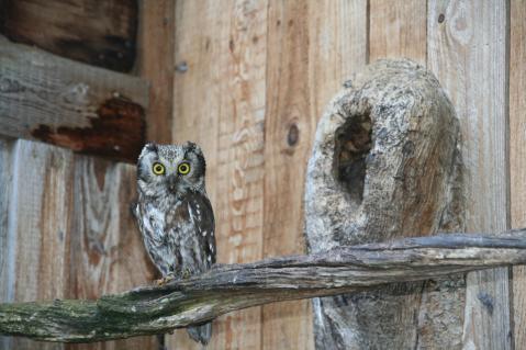 Das Gehege war mit senkrecht stehenden Baumstämmen und deren natürlichen Astverzweigungen ausgestattet. Ein Teil der Voliere ist als Schutz gegen Regen und Wind überdacht. Die Bodendekoration besteht aus einem Wurzelstock und drei Felsbrocken. Raufusskäuze baden gerne. Darum ist eine nicht zu tiefe Wasserschale wichtig, damit die Eulen darin gut stehen können. Die Voliere weist zwei Bruthöhlen auf: eine Naturhöhle und eine aus Holzplatten. Da Raufusskäuze mit einem Jahr geschlechtsreif sind, war ich auf das kommende Jahr gespannt. Es wurde Februar, es wurde März, dann April, und ich konnte nicht einmal das Balzrufen des Männchens hören. Nicht das kleinste Anzeichen von Brutstimmung.